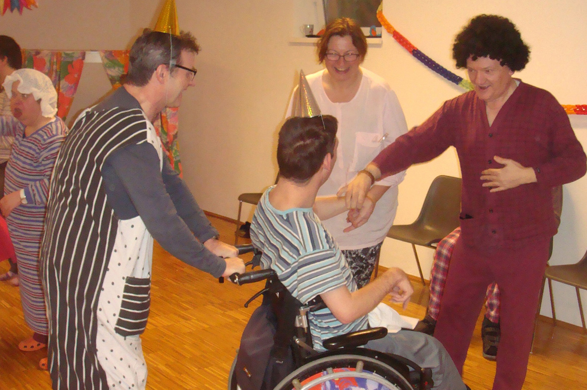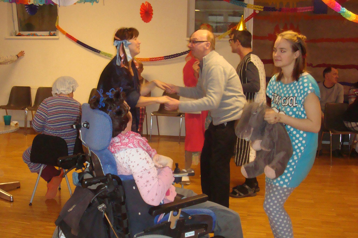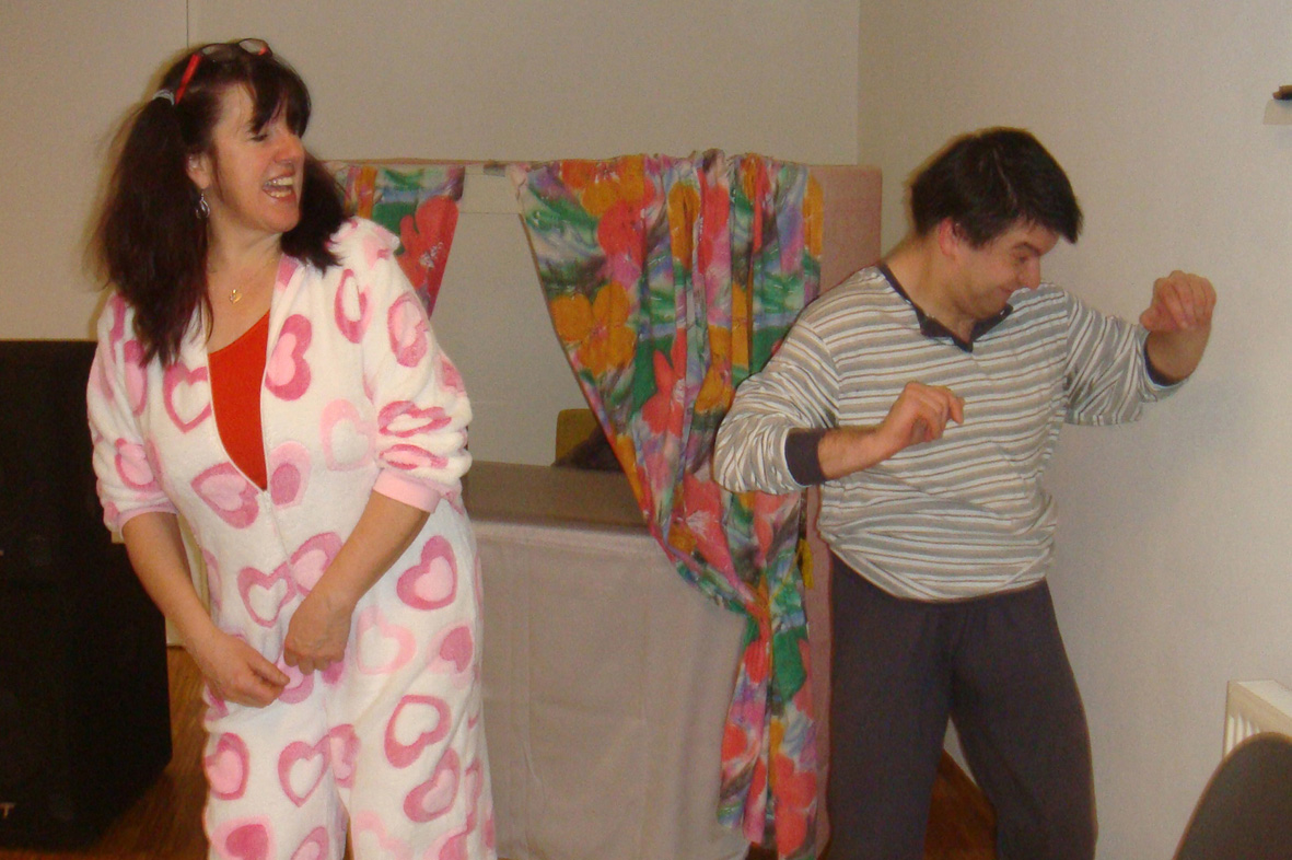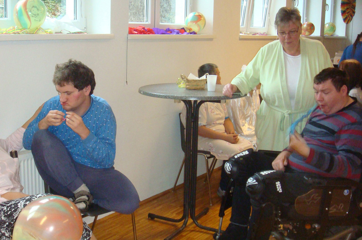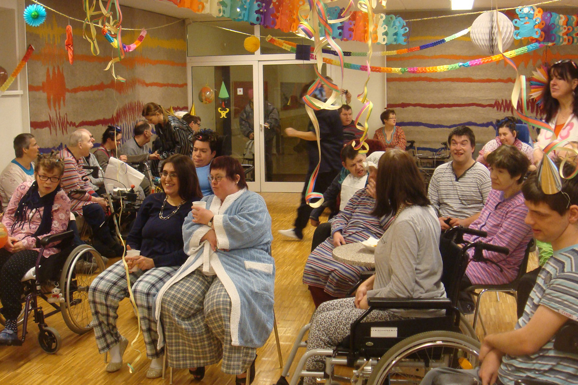 Mit guter Laune und wunderbaren Faschingskrapfen genossen die Teilnehmerinnen und Teilnehmer das Fest. Polonaise tanzend, bewegte sich die illustre Gesellschaft durch den bunt geschmückten Bewegungsraum. Einer der Höhepunkte war eine Puppentheateaufführung. Auch die WerkstättenmitarbeiterInnen waren mit dem Besuch und dem Verlauf der von ihnen gestalteten Pyjamaparty sichtlich zufrieden :)