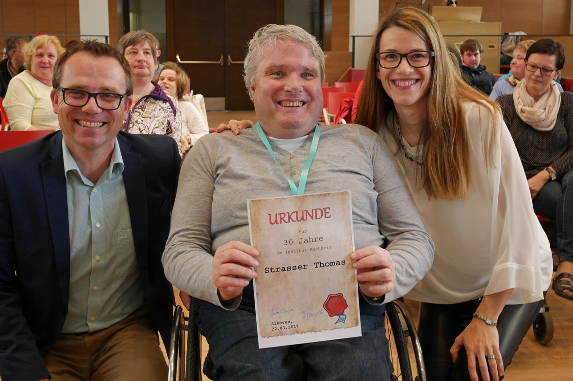 Zur alljährlichen Versammlung der KlientInnen aus der Fähigkeitsorientierten Aktivität erschienen wieder viele von ihnen, um gemeinsam die langjährigen MitarbeiterInnen zu ehren und ihre Fragen an die Geschäftsführung zu stellen. Besonders die geplanten Werkstätten in den neuen Außenstellen des Instituts, die in den kommenden Jahren umgesetzt werden, lagen ihnen am Herzen. Daneben freuten sich wieder sechs KlientInnen über ihre Ehrung anlässlich des 25zigsten beziehungsweise 30igsten Dienstjubiläums.