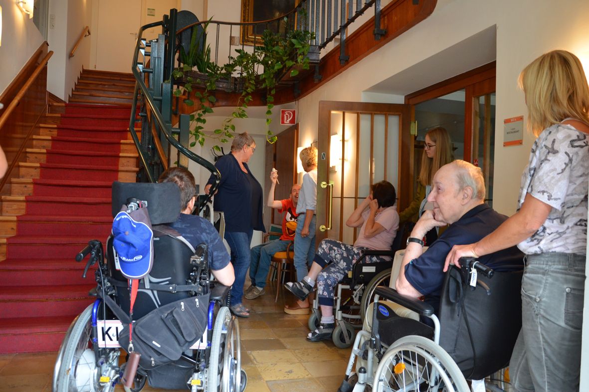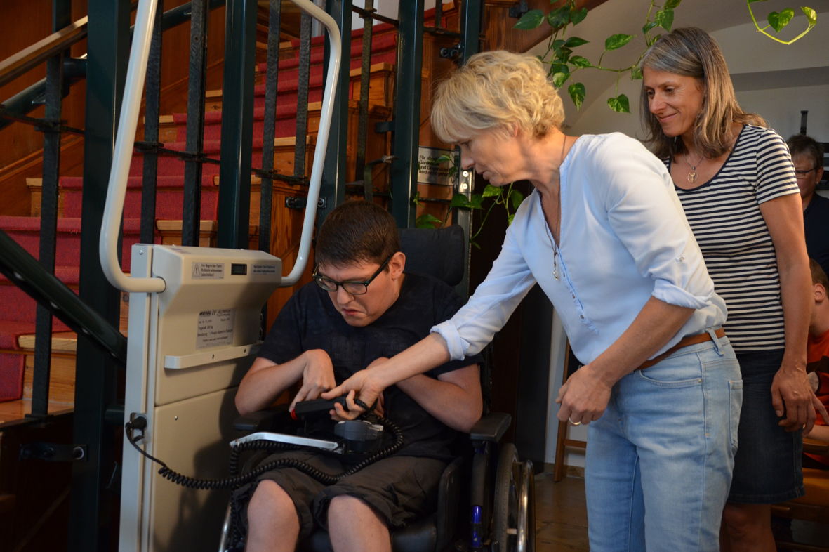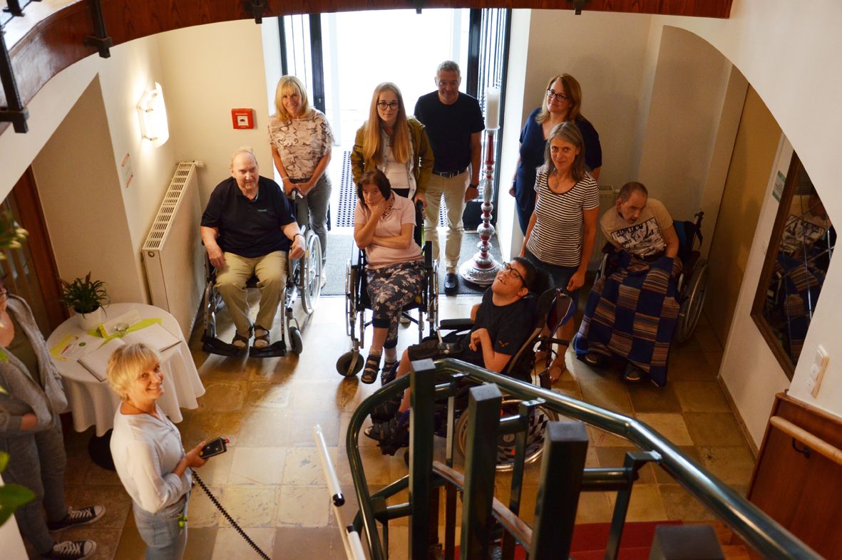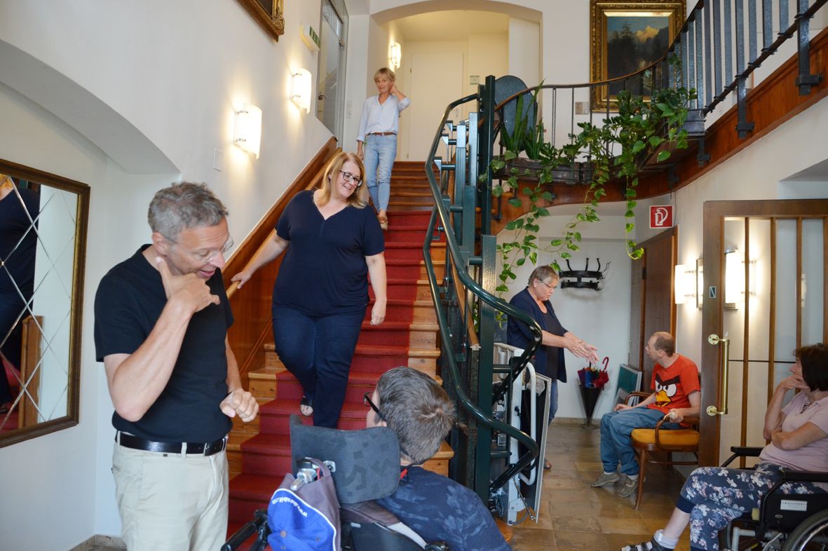 Mit einer gemeinsamen Testfahrt wurde am 18. Juli der neue Treppenlift im Altbau der Schön, dem Kreuzbichlhof, in Betrieb genommen. Einige Bewohnerinnen und Bewohner waren gekommen um – zum Teil zum allerersten Mal – den Verwaltungsbereich unserer Einrichtung zu besuchen. Durch die großartige Unterstützung vieler Spenderinnen und Spender, die das Spendenprojekt "Treppenlift" unterstützt hatten, wurde die Errichtung möglich.