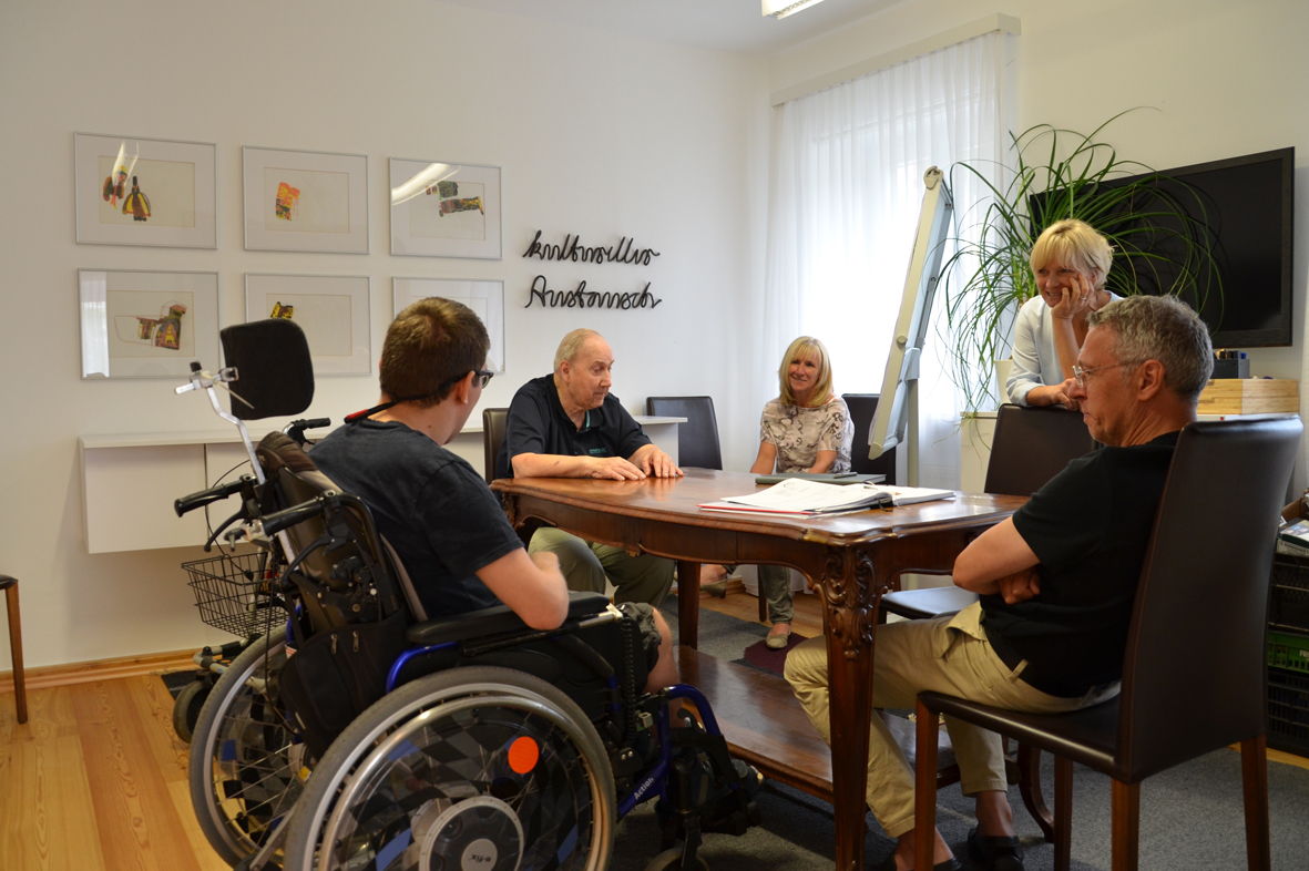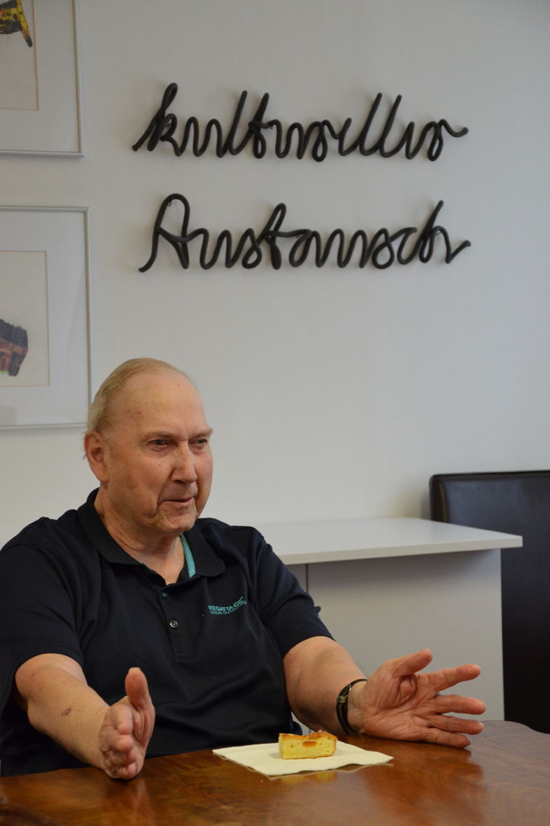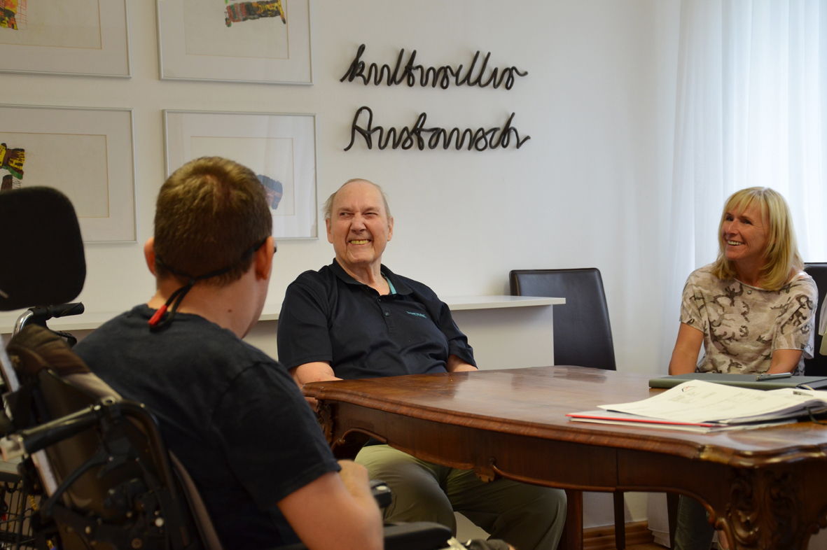 Nach der ersten Fahrt oben angekommen, wurde den Gästen frischgebackener Kuchen serviert und sie absolvierteh eine Führung durch die Büroräume. Bewohnersprecher Alexander K. besuchte GF Mag. Thomas Weixlbaumer zu einer ersten Besprechung in dessen Büro. Seinen Abschluss fand das hausinterne Event in einer gemütlichen Plauderrunde im Besprechungszimmer. Ein Austausch auf Augenhöhe, bei dem sich die Geschäftsführung und die agogische Leitung besonders darüber freute, dass die beiden Bewohnersprecher bekräftigten, wie gerne sie in Schön wohnen!