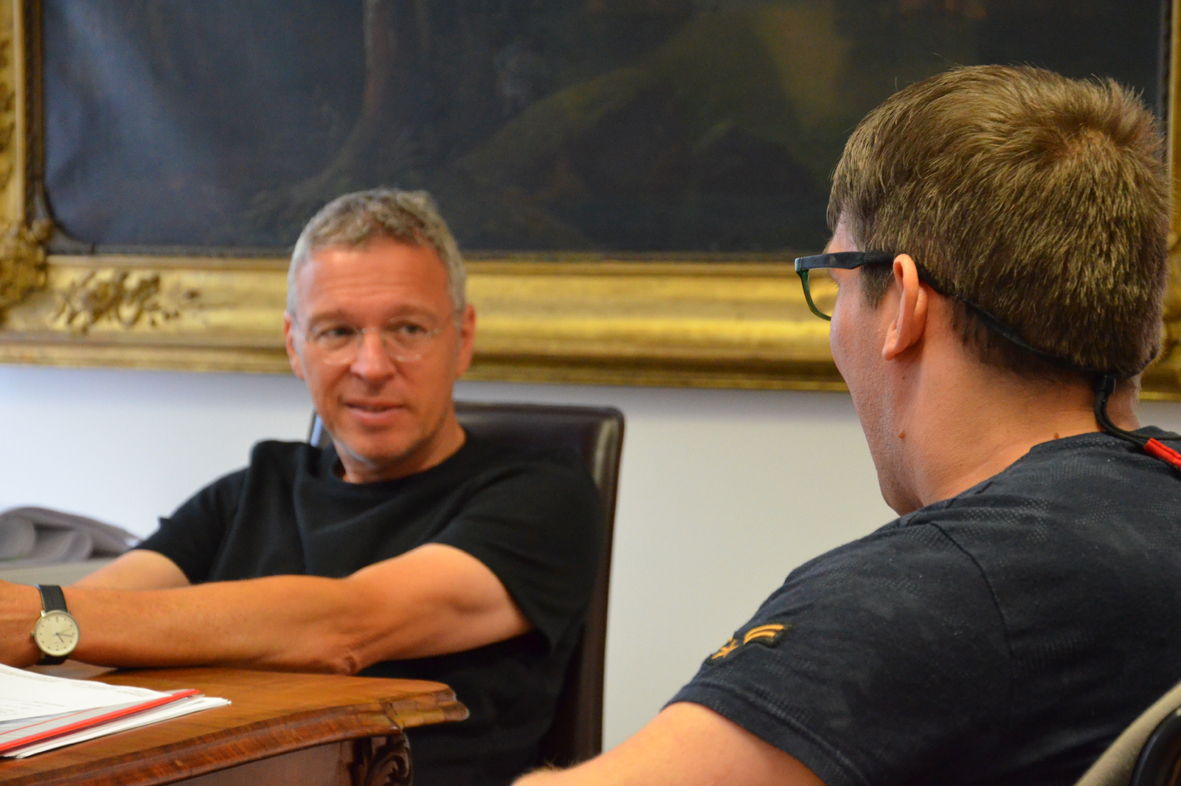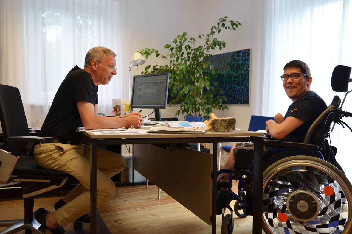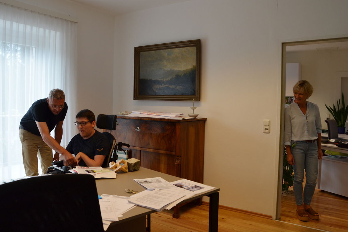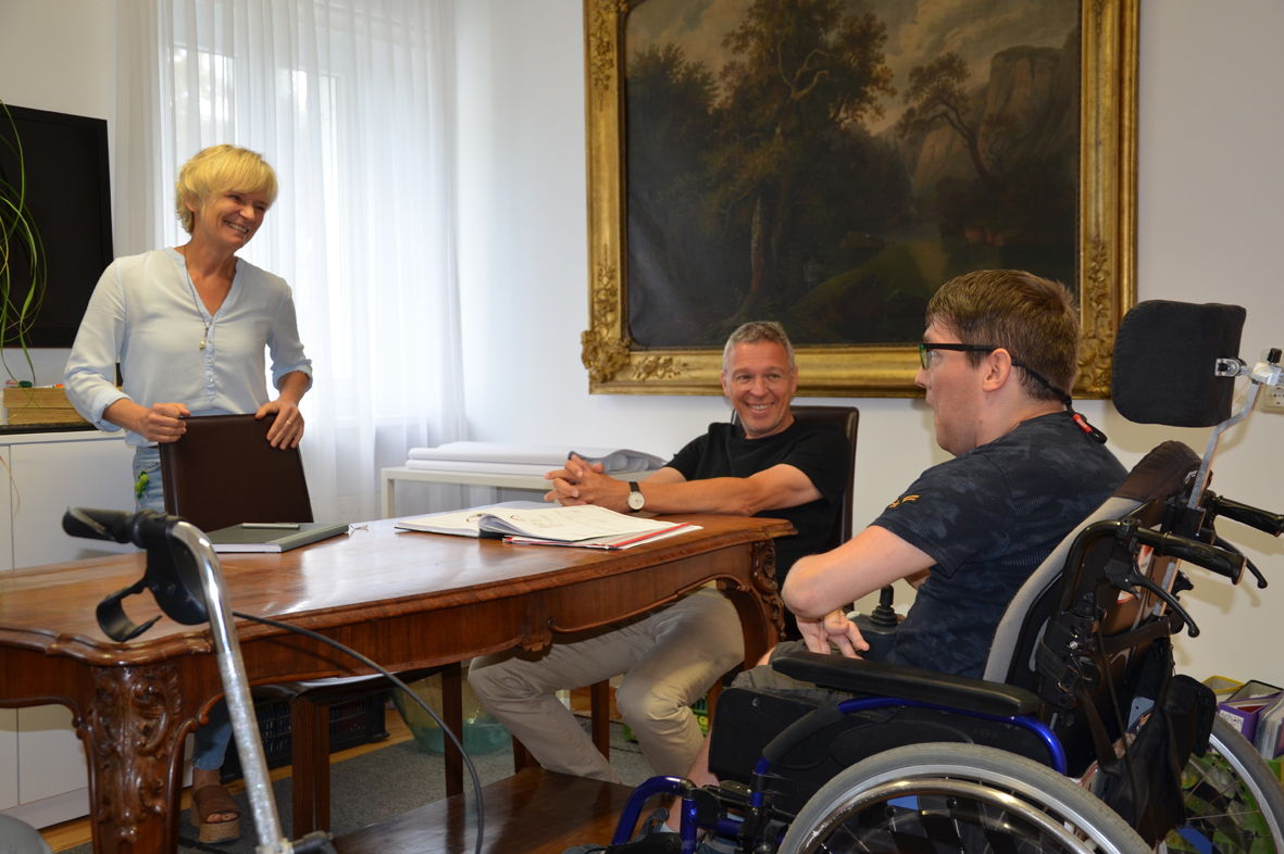 Nach der ersten Fahrt oben angekommen, wurde den Gästen frischgebackener Kuchen serviert und sie absolvierteh eine Führung durch die Büroräume. Bewohnersprecher Alexander K. besuchte GF Mag. Thomas Weixlbaumer zu einer ersten Besprechung in dessen Büro. Seinen Abschluss fand das hausinterne Event in einer gemütlichen Plauderrunde im Besprechungszimmer. Ein Austausch auf Augenhöhe, bei dem sich die Geschäftsführung und die agogische Leitung besonders darüber freute, dass die beiden Bewohnersprecher bekräftigten, wie gerne sie in Schön wohnen!