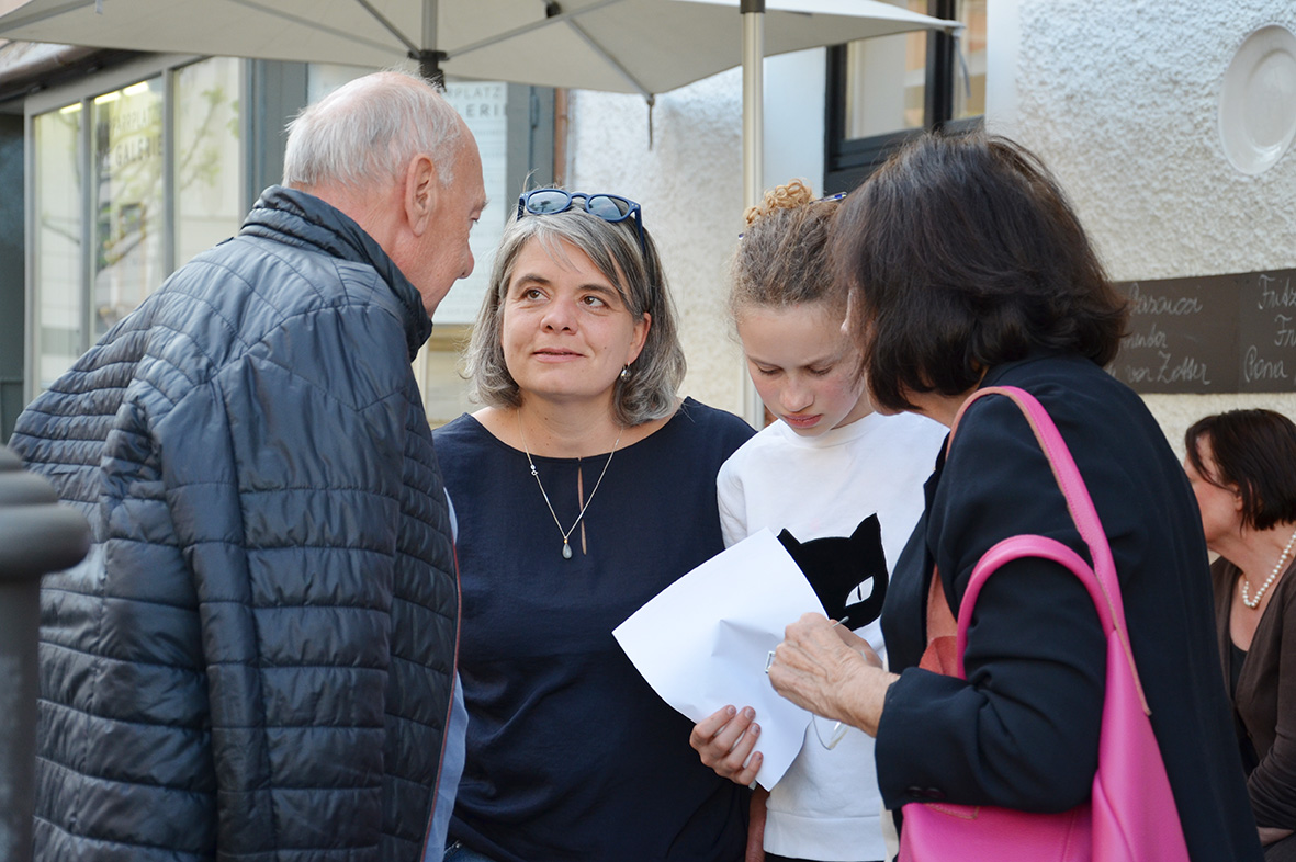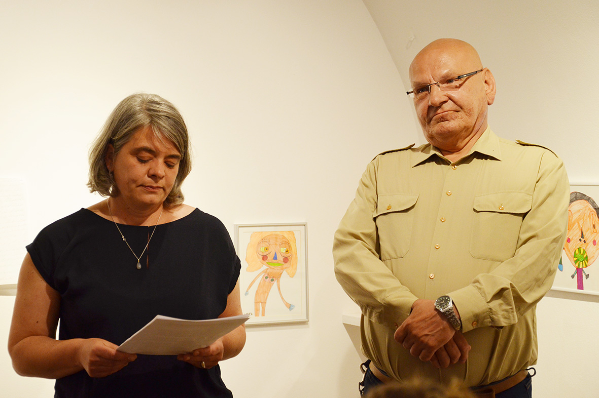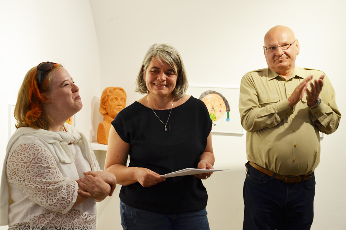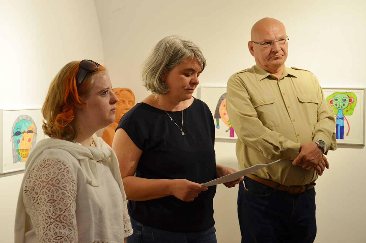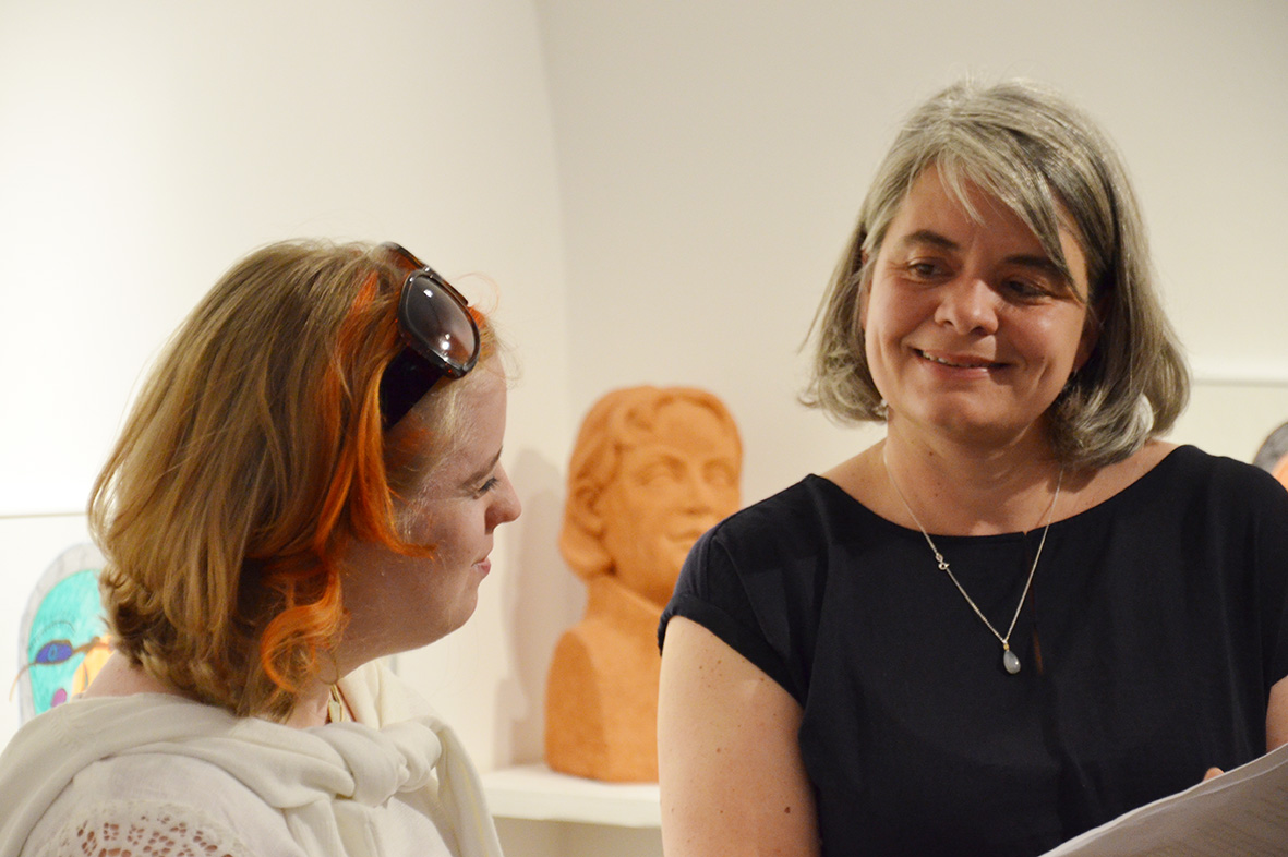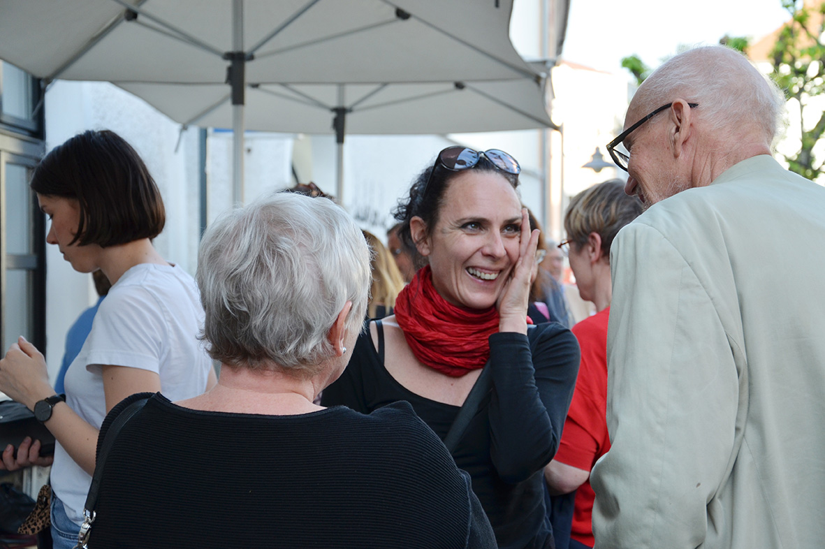 Interessiert lauschte das Publikum den Ausführungen von Kristiane Petersmann, die die spannend im Raum platzierten Köpfe – Filzstiftzeichnungen der Kirchdorferin Magdalena Aschauer und Keramiken von Manfred Tessmer – und die Künstlerin und den Künstler vorstellte. Angeregte Betrachtungen und Unterhaltungen über die gezeigten Portraits folgten, ein langer Abend war fast vorprogrammiert.