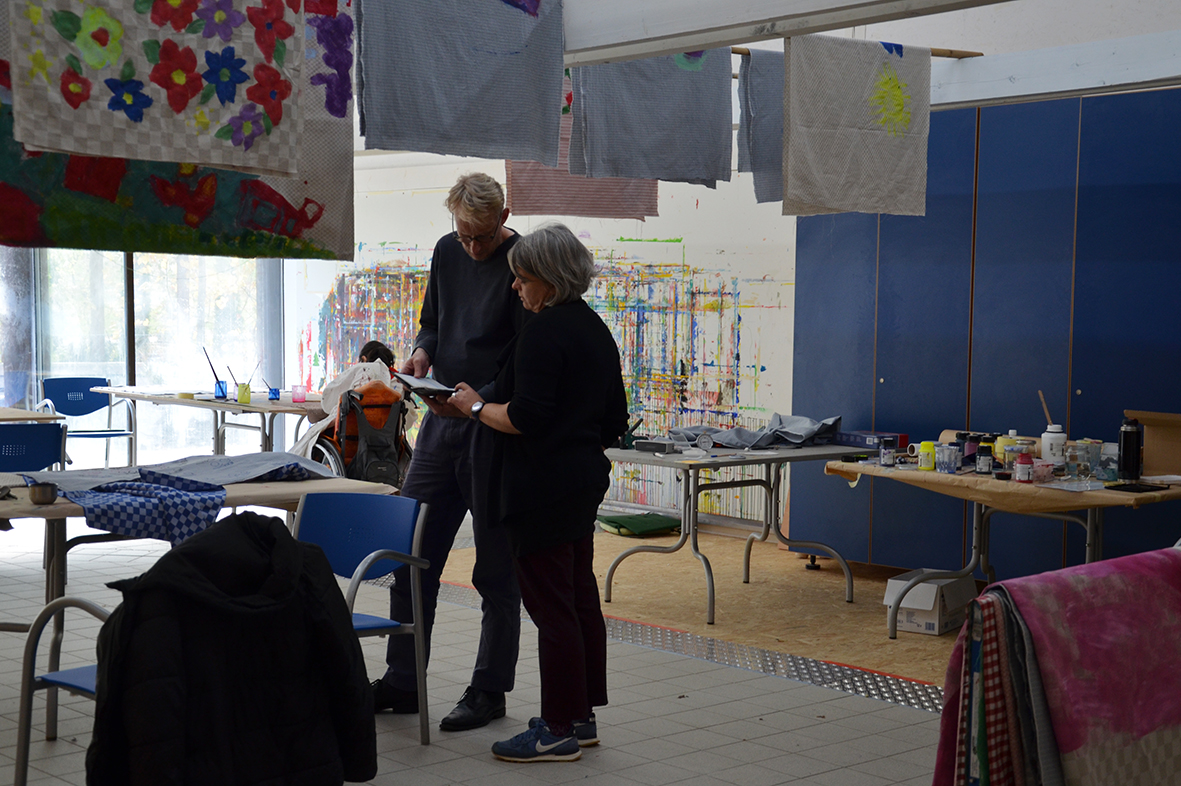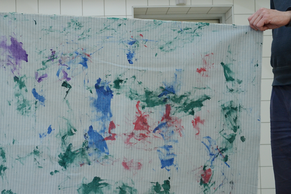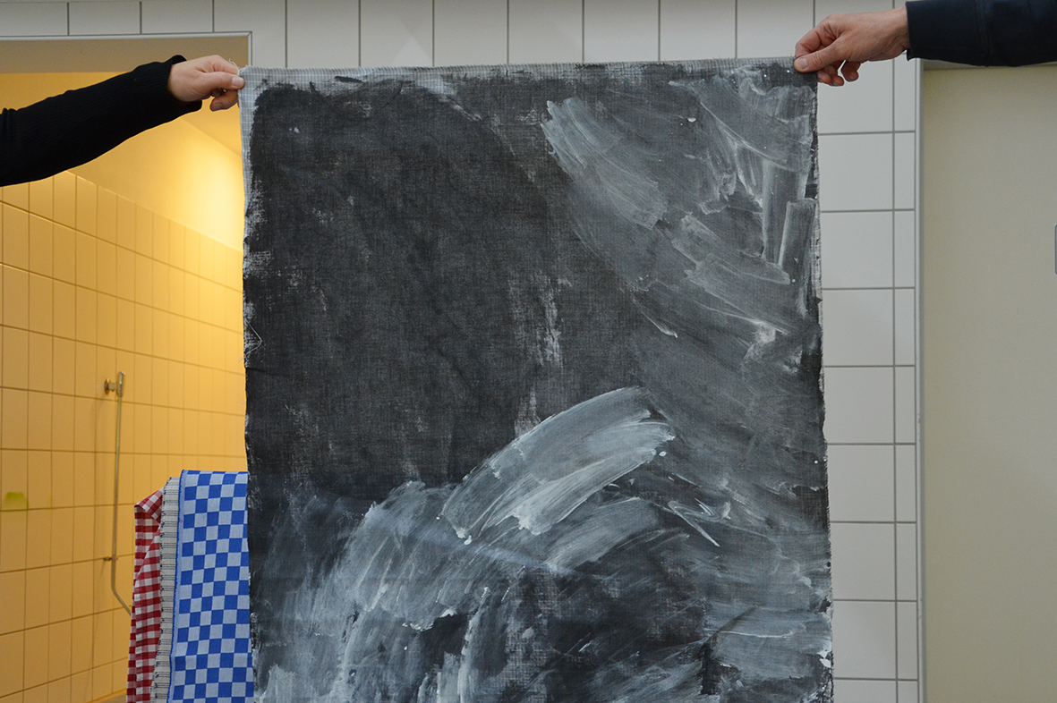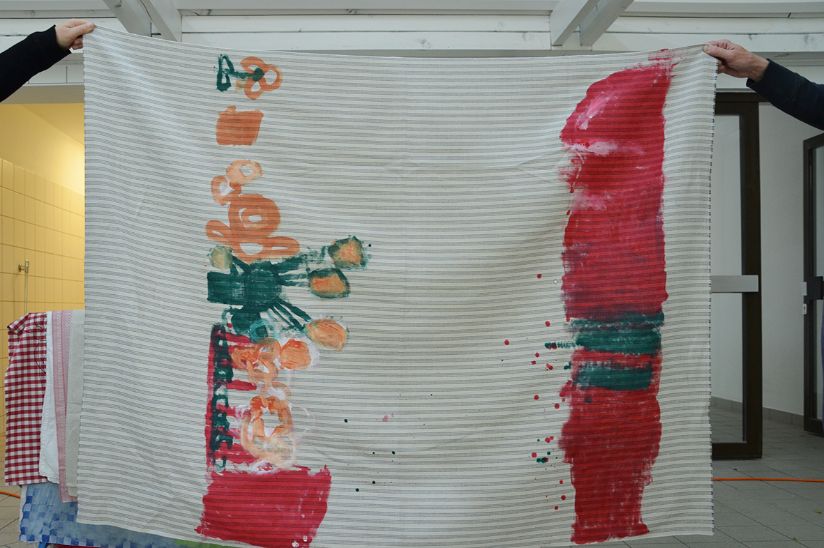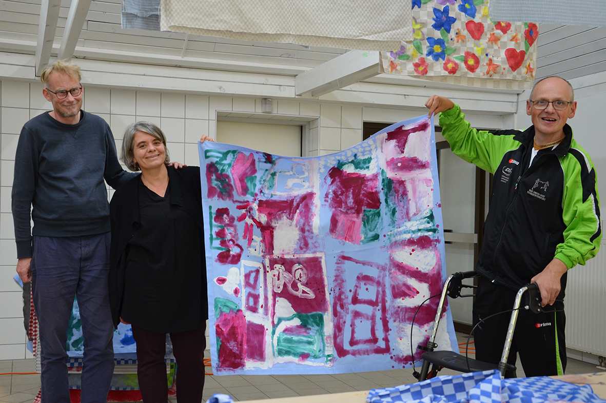 Die Freude am Gestalten der Tücher war ganz auf der Seite der Protagonisten, die bei dieser Gelegenheit erstmals im neu gestalteten Atelier – dem ehemaligen Hallenbad – zu Werke gegangen waren...