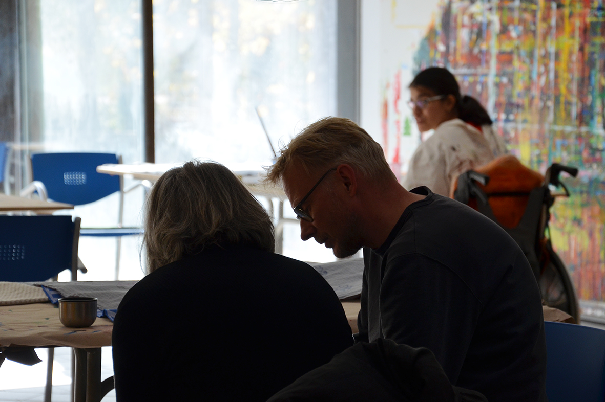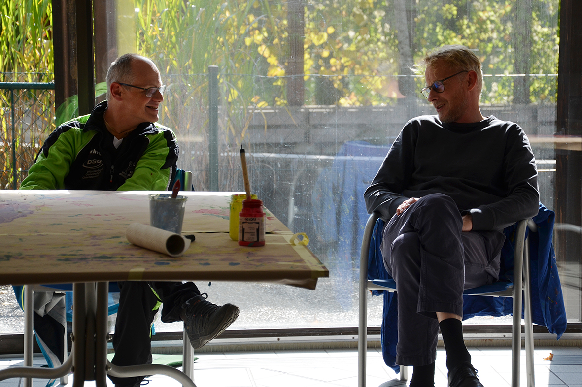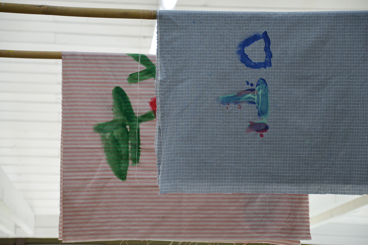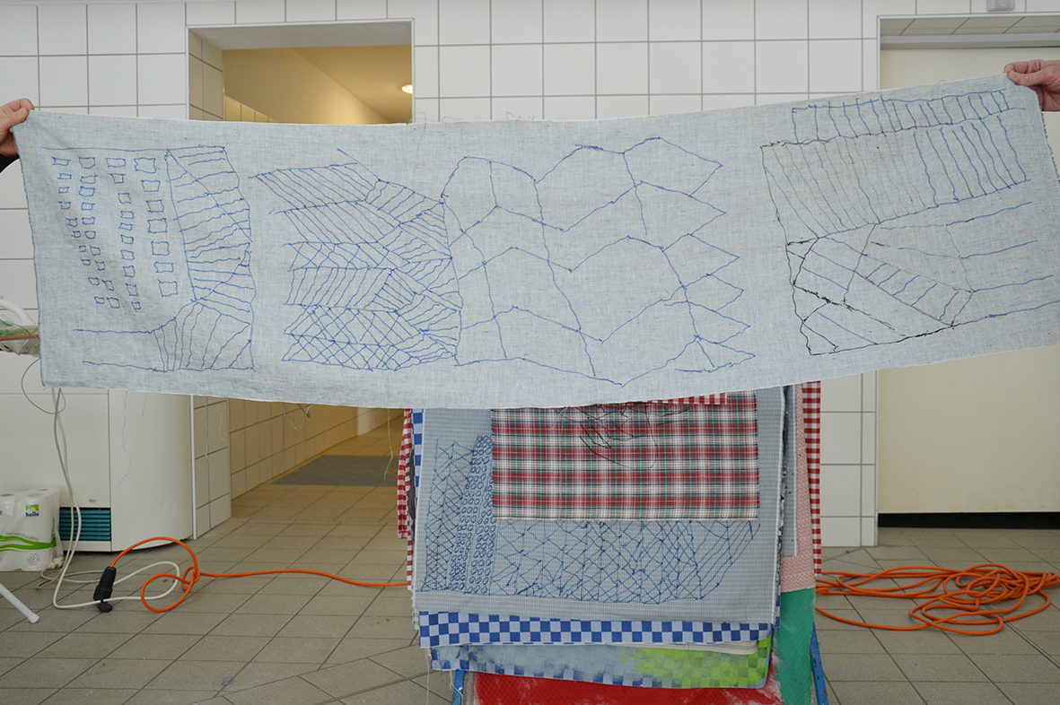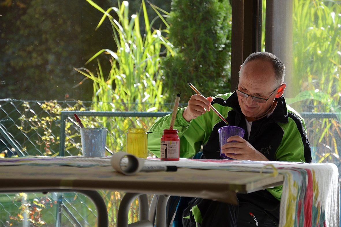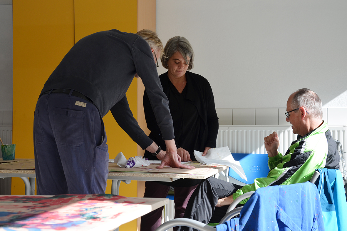 Die Freude am Gestalten der Tücher war ganz auf der Seite der Protagonisten, die bei dieser Gelegenheit erstmals im neu gestalteten Atelier – dem ehemaligen Hallenbad – zu Werke gegangen waren...