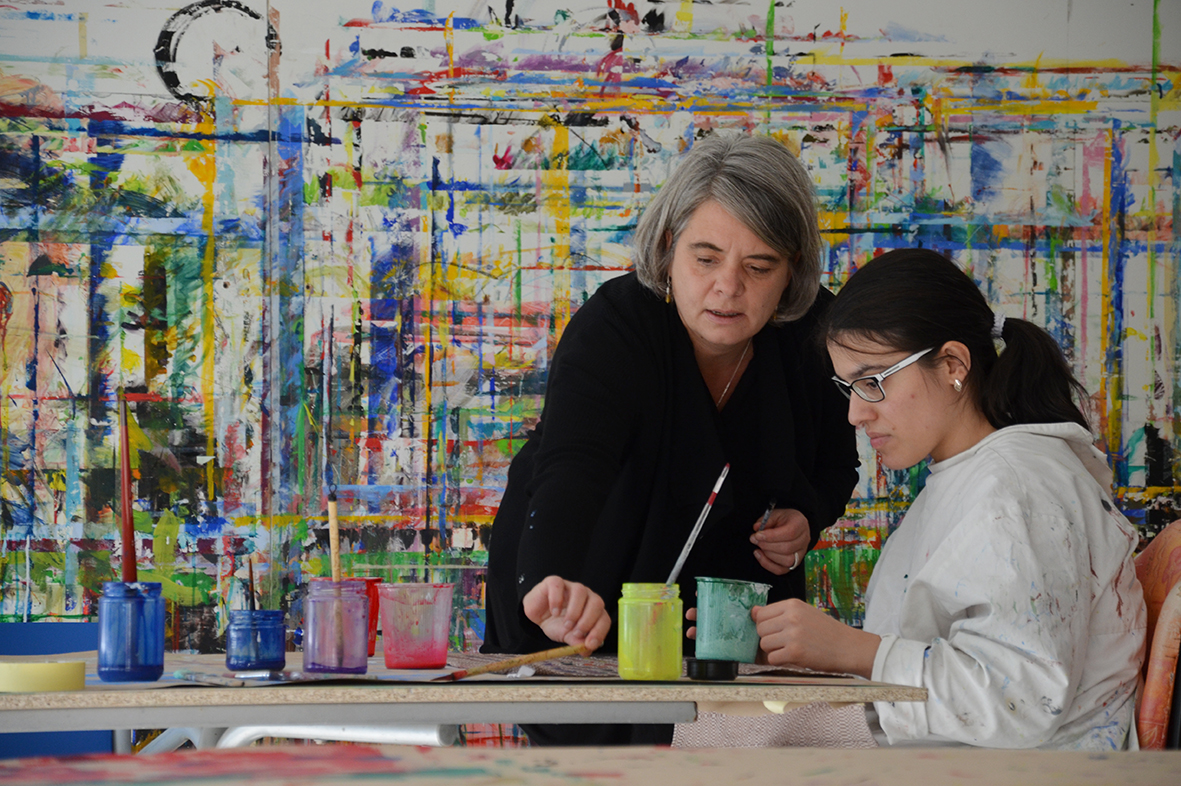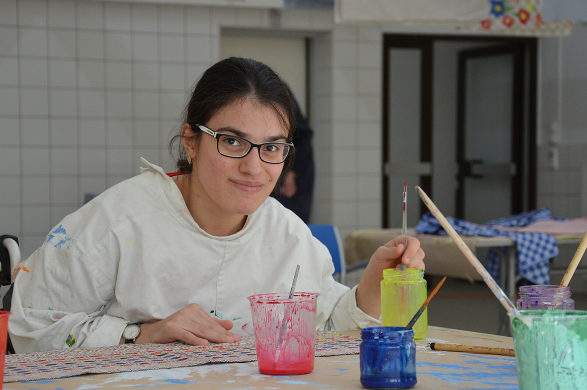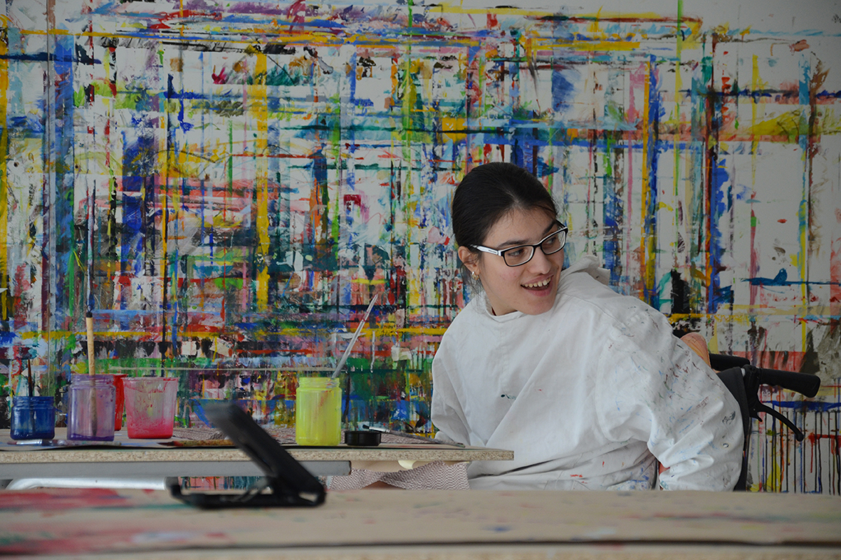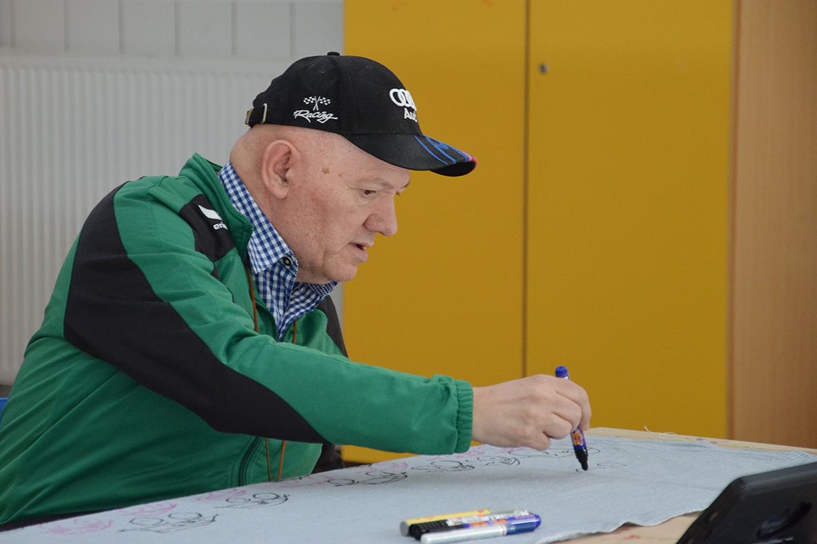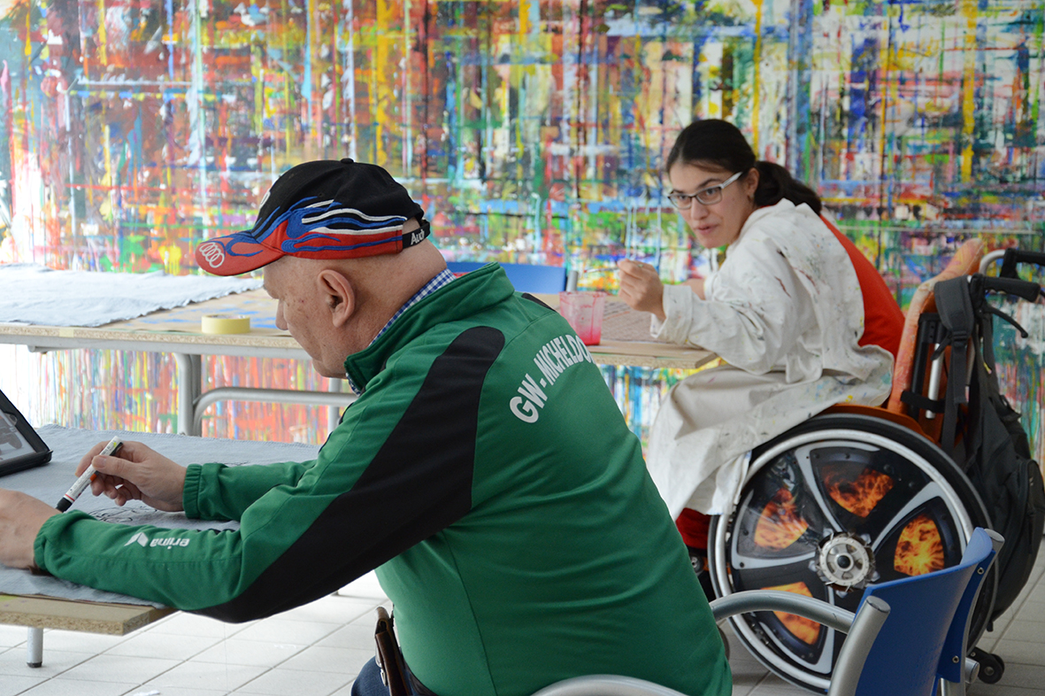 Die Freude am Gestalten der Tücher war ganz auf der Seite der Protagonisten, die bei dieser Gelegenheit erstmals im neu gestalteten Atelier – dem ehemaligen Hallenbad – zu Werke gegangen waren...