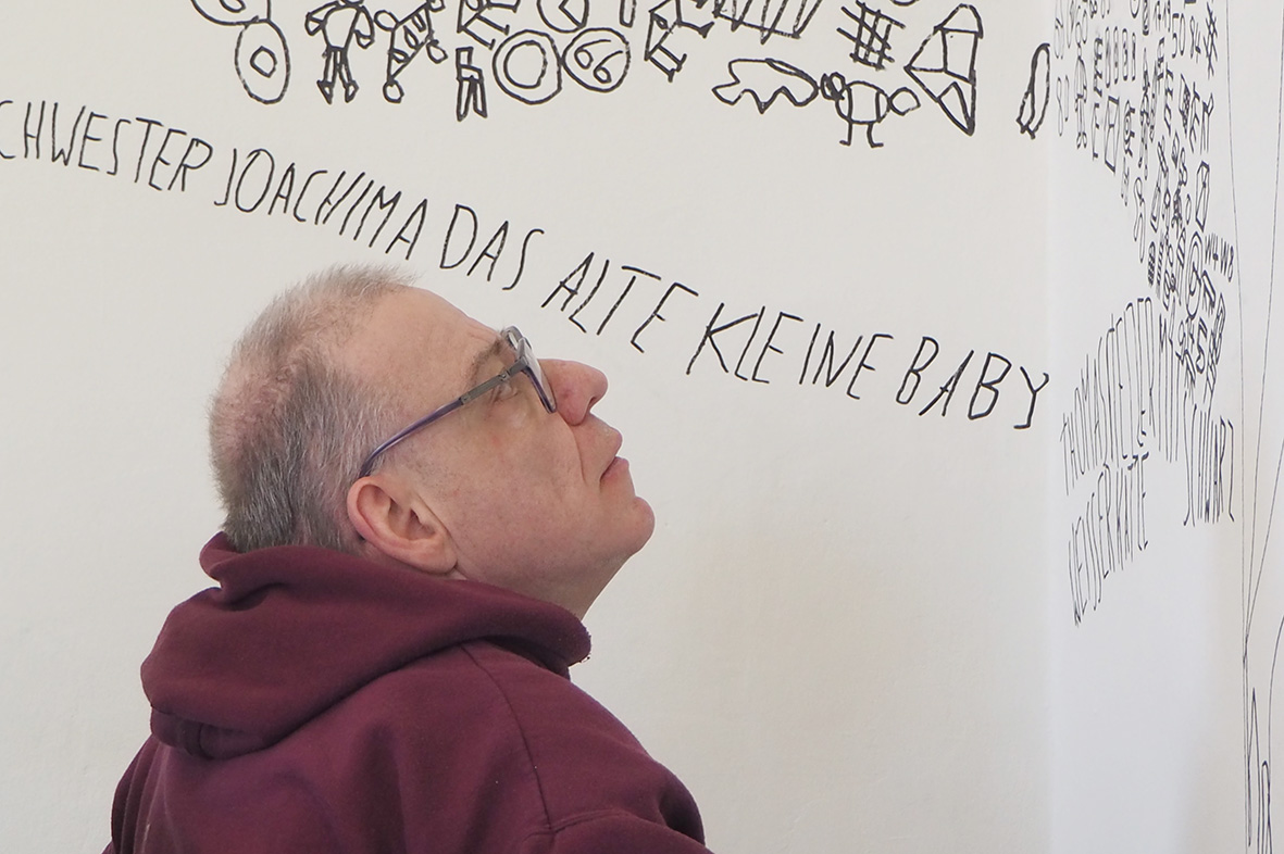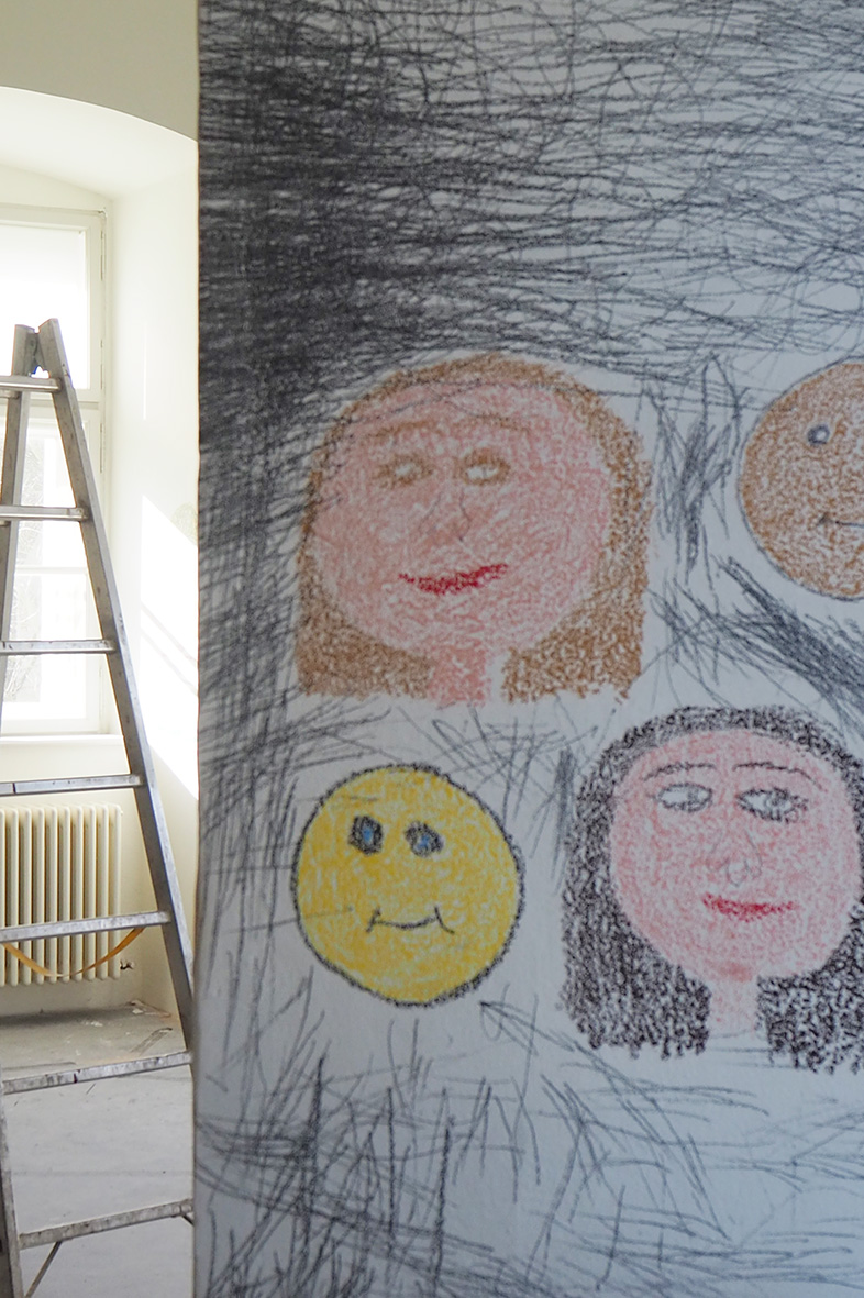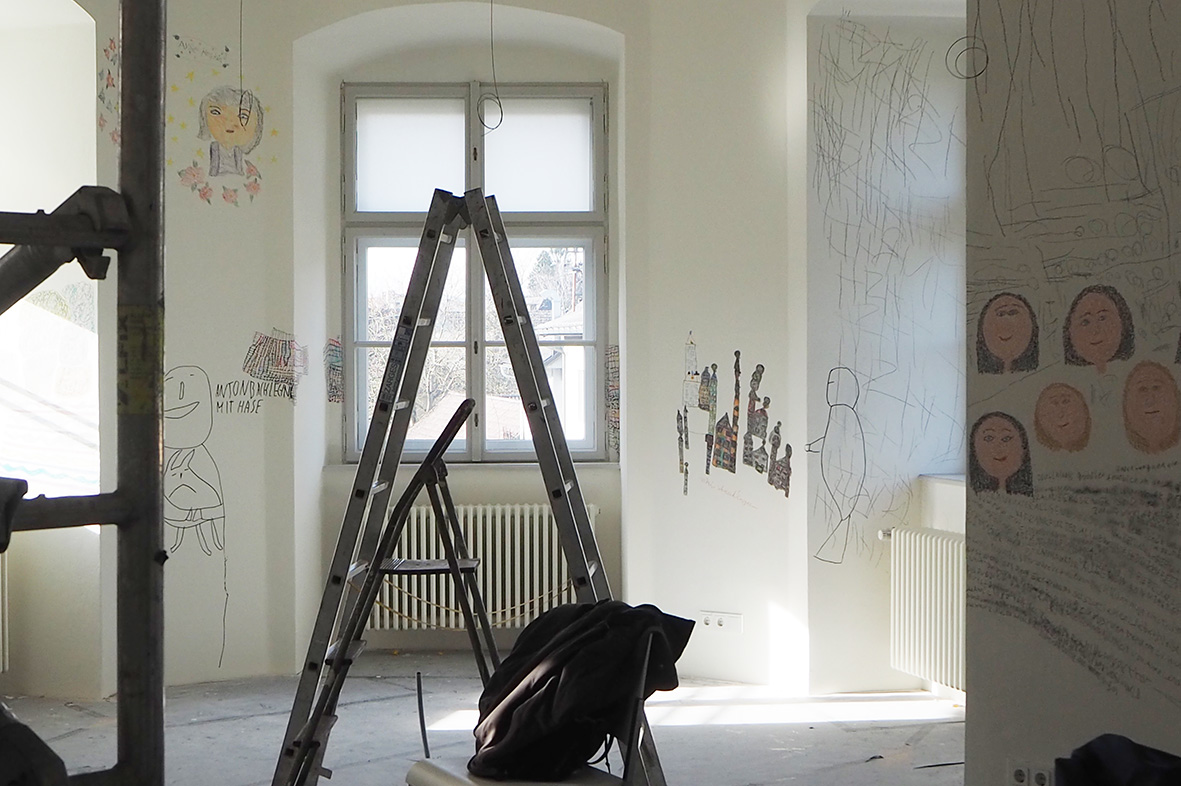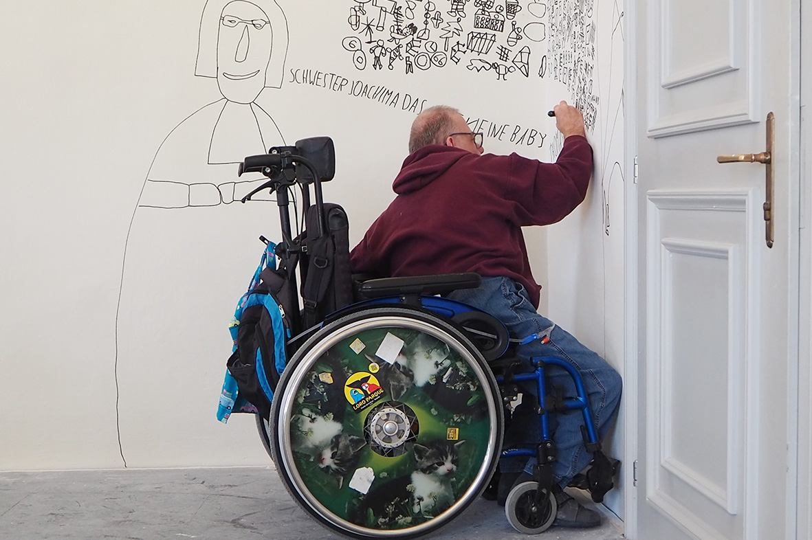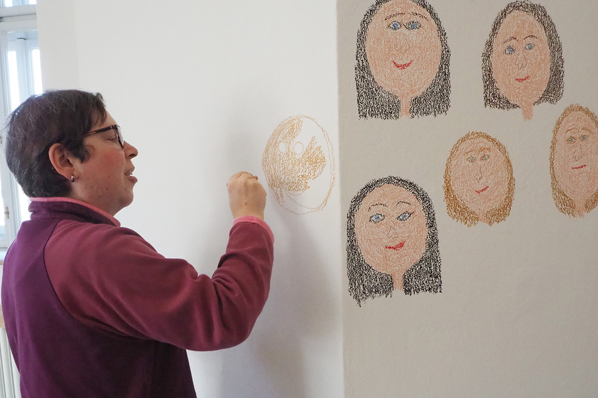 Gearbeitet wurde vorwiegend mit lichtechten Tusche- und Graphitstiften, aber auch graphisch mit Farben und Pinseln. „Die intuitive Zeichnung ist eine Setzung, die im Augenblick entsteht. Im Moment des Betrachtens überträgt sich dieser Augenblick als Schnittstelle zwischen Vergangenem und der Gegenwart,“ beschreibt Mag. Kristiane Petersmann, Leiterin der KULTURFORMEN, die den Workshop gemeinsam mit Bühnenbildner Moritz Nitsche erdacht und mit den Künstler*innen durchgeführt hat, die Idee des Konzeptes für die Gestaltung des Raumes 14 in Schloss Hartheim.