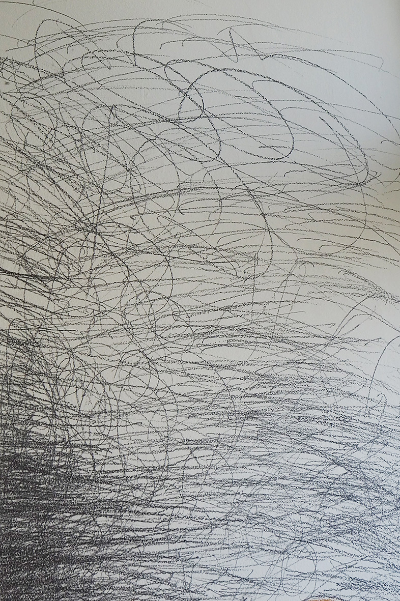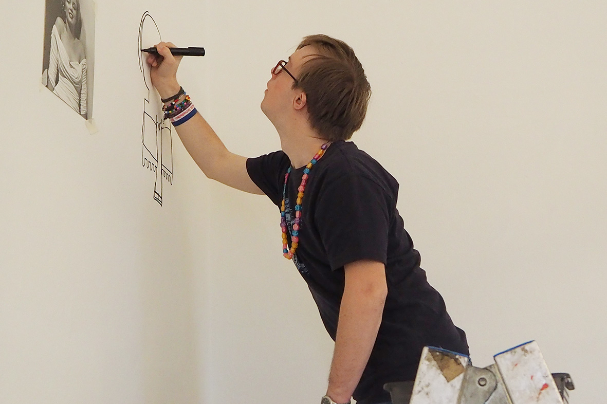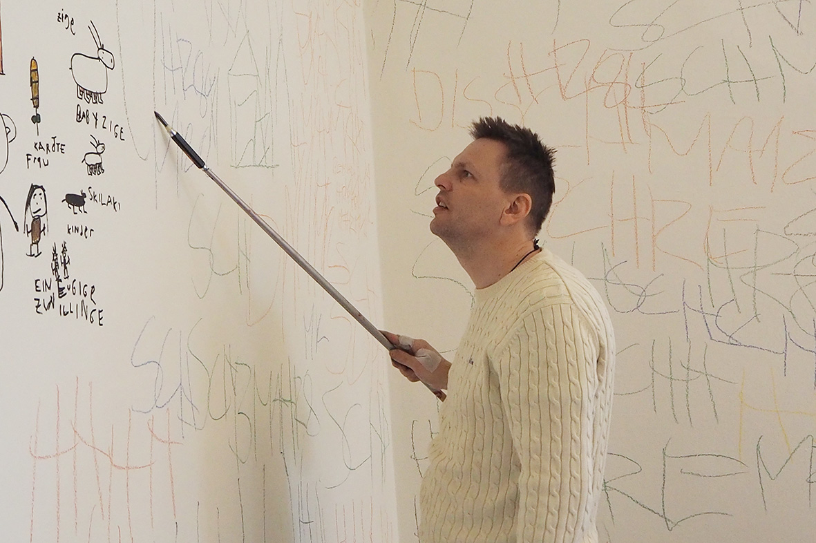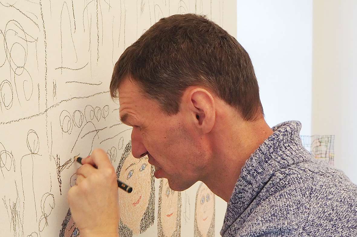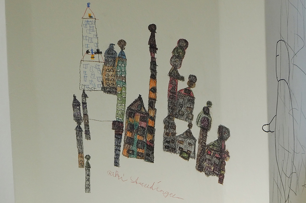 Gearbeitet wurde vorwiegend mit lichtechten Tusche- und Graphitstiften, aber auch graphisch mit Farben und Pinseln. „Die intuitive Zeichnung ist eine Setzung, die im Augenblick entsteht. Im Moment des Betrachtens überträgt sich dieser Augenblick als Schnittstelle zwischen Vergangenem und der Gegenwart,“ beschreibt Mag. Kristiane Petersmann, Leiterin der KULTURFORMEN, die den Workshop gemeinsam mit Bühnenbildner Moritz Nitsche erdacht und mit den Künstler*innen durchgeführt hat, die Idee des Konzeptes für die Gestaltung des Raumes 14 in Schloss Hartheim.