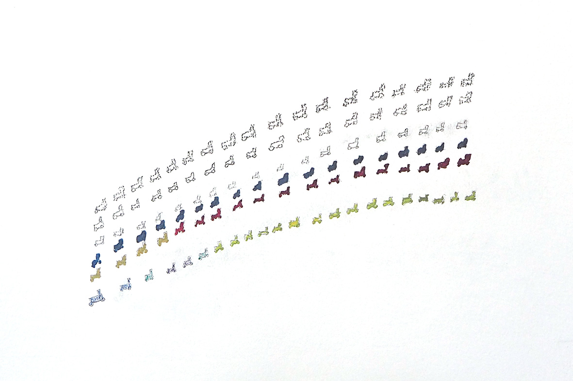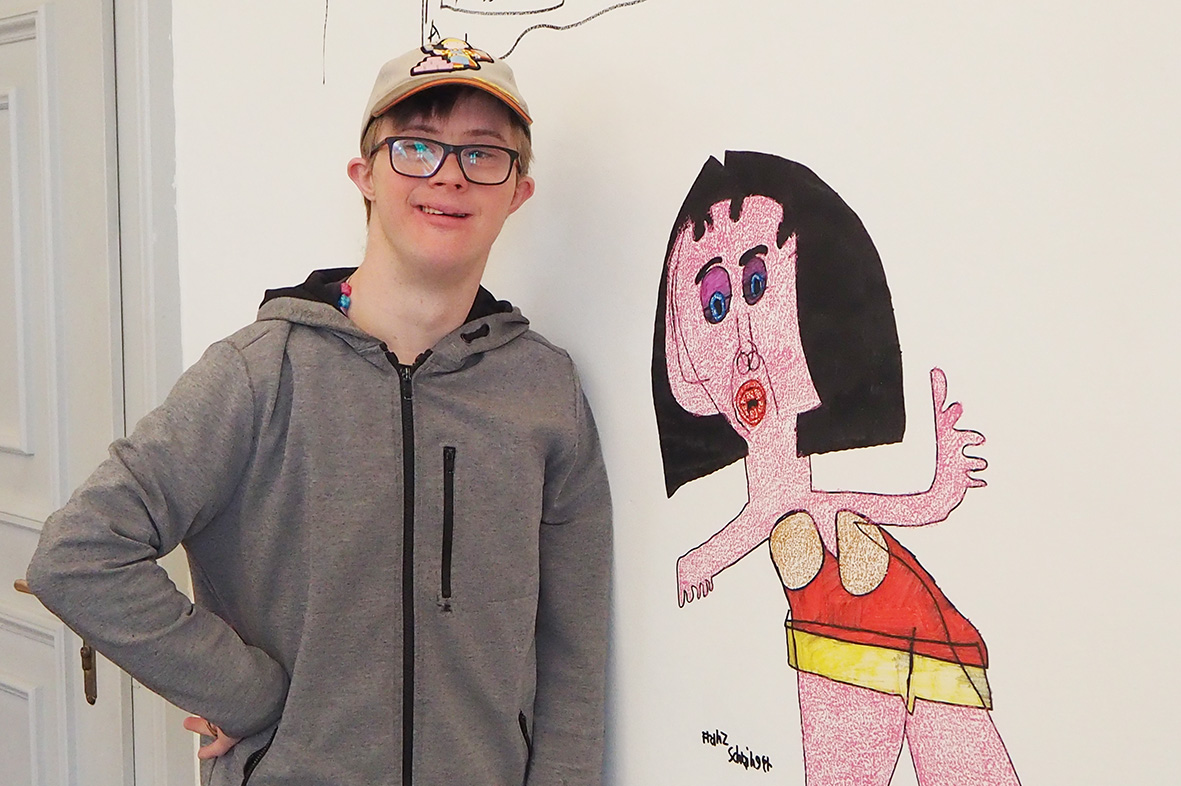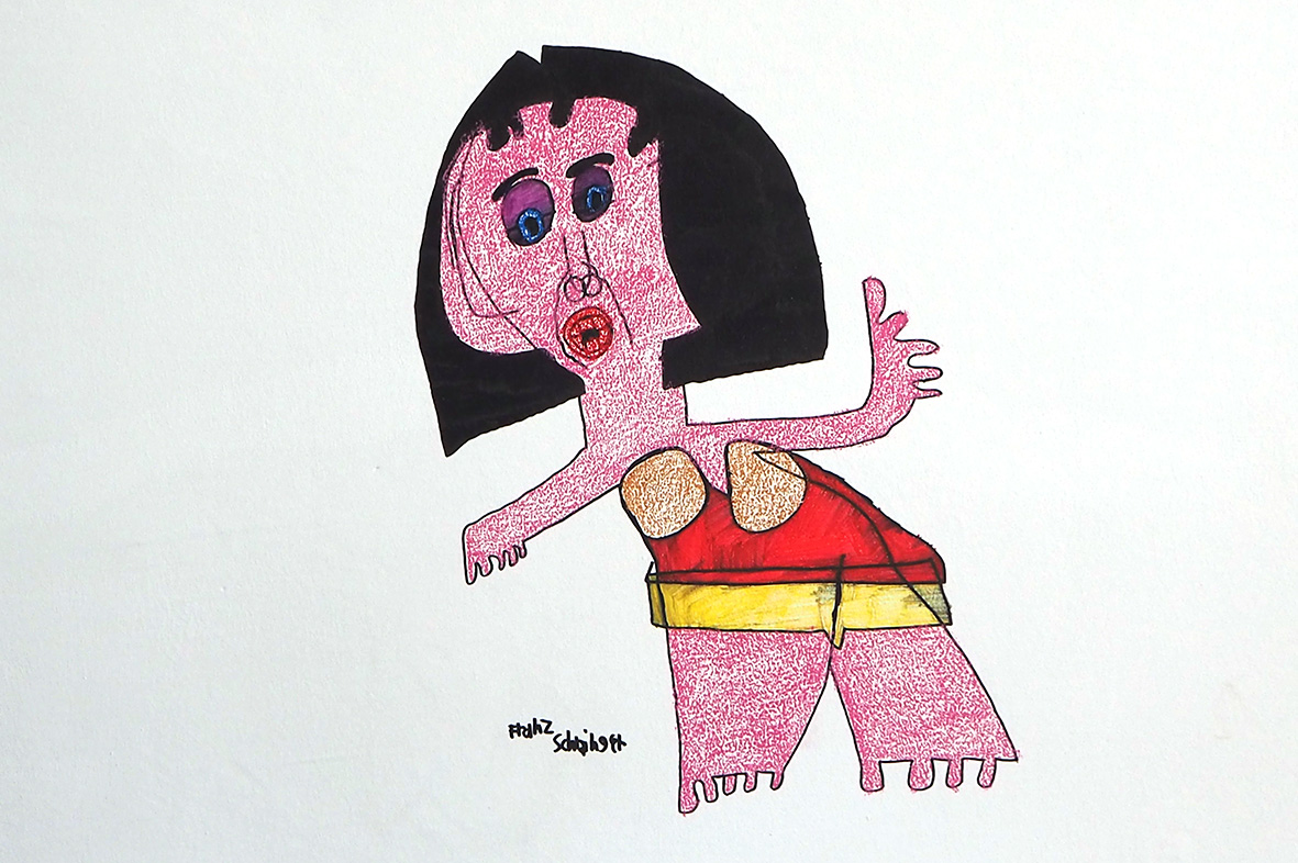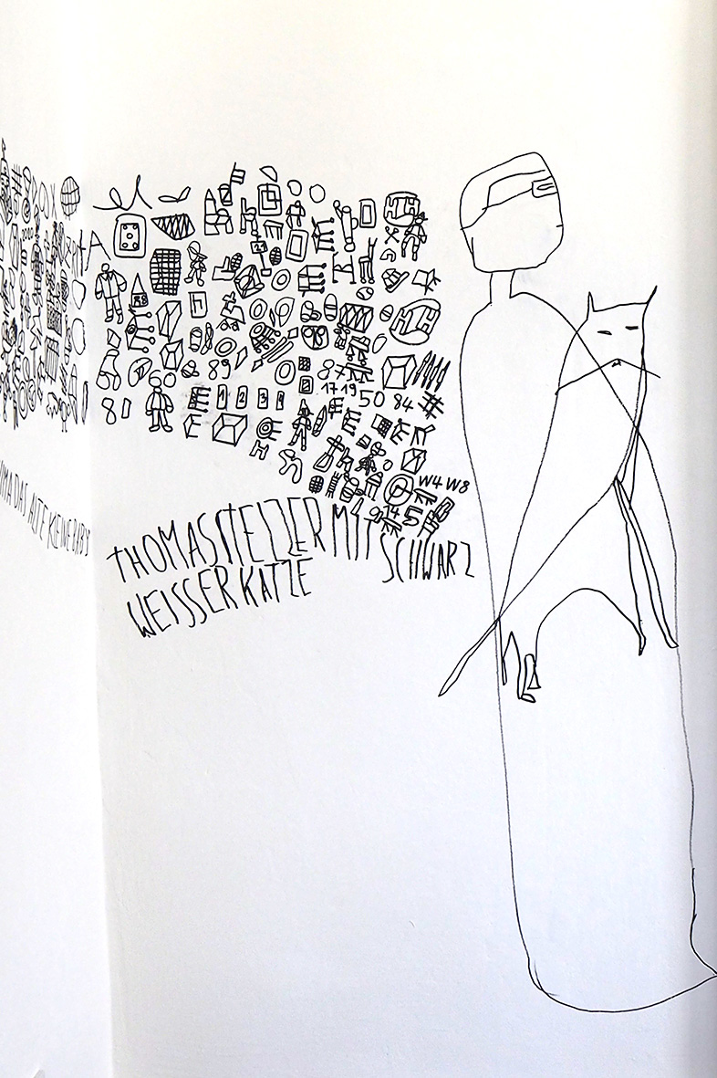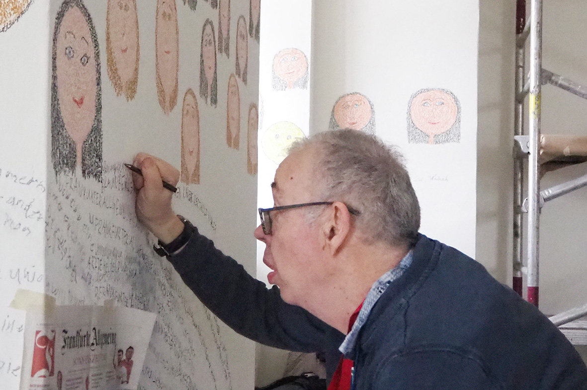 Gearbeitet wurde vorwiegend mit lichtechten Tusche- und Graphitstiften, aber auch graphisch mit Farben und Pinseln. „Die intuitive Zeichnung ist eine Setzung, die im Augenblick entsteht. Im Moment des Betrachtens überträgt sich dieser Augenblick als Schnittstelle zwischen Vergangenem und der Gegenwart,“ beschreibt Mag. Kristiane Petersmann, Leiterin der KULTURFORMEN, die den Workshop gemeinsam mit Bühnenbildner Moritz Nitsche erdacht und mit den Künstler*innen durchgeführt hat, die Idee des Konzeptes für die Gestaltung des Raumes 14 in Schloss Hartheim.
