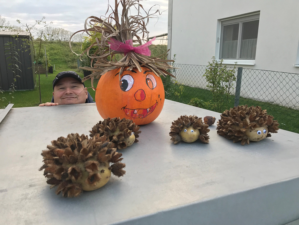 Beim Spazieren durch die Nachbarschaft und Bewundern der herbstlichen Dekorationsideen kam auch der Spaß nicht zu kurz. "Kartoffeligel" und "Kürbisköpfe" verschönern jetzt die Gruppenräume!