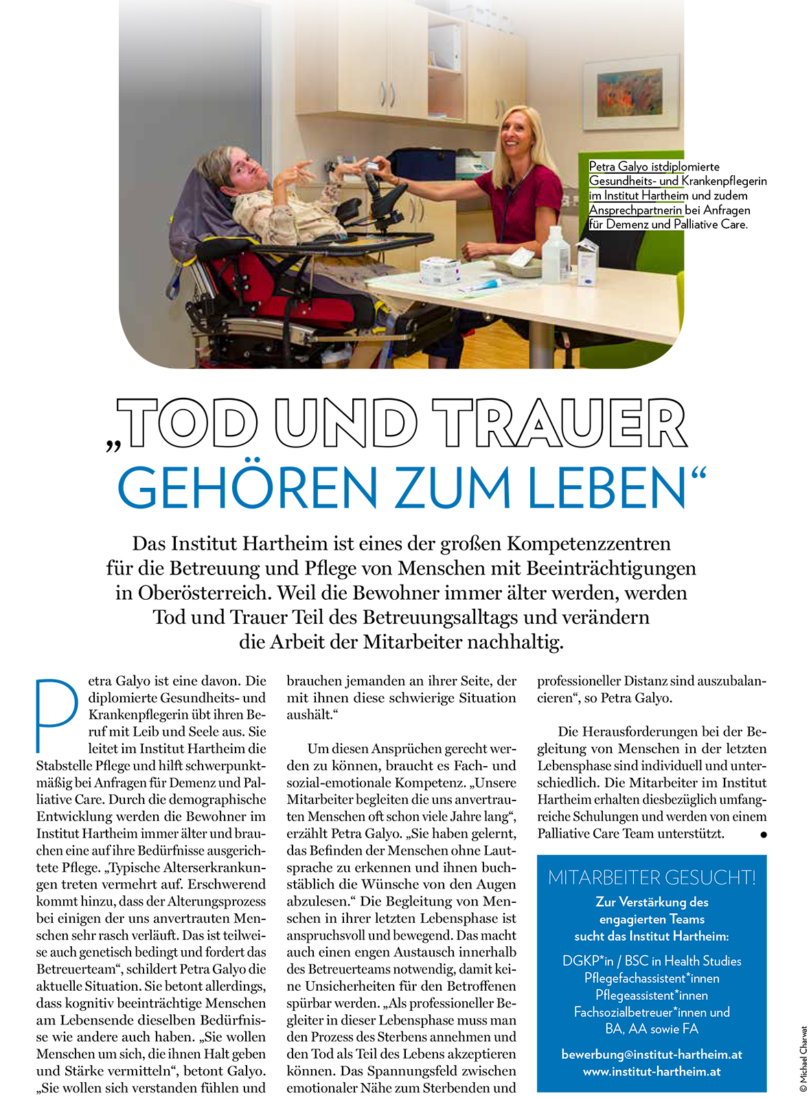Petra Galyo ist eine davon. Die diplomierte Gesundheits- und Krankenpflegerin übt ihren Beruf mit Leib und Seele aus. Sie leitet im Institut Hartheim die Stabstelle Pflege und hilft  schwerpunktmäßig bei Anfragen für Demenz und Palliative Care. Durch die demographische Entwicklung werden die Bewohner im Institut Hartheim immer älter und brauchen eine auf ihre Bedürfnisse ausgerichtete Pflege. „Typische Alterserkrankungen treten vermehrt auf. Erschwerend kommt hinzu, dass der Alterungsprozess bei einigen der uns anvertrauten Menschen sehr rasch verläuft. Das ist teilweise auch genetisch bedingt und fordert das Betreuerteam“, schildert Petra Galyo die aktuelle Situation. Sie betont allerdings, dass kognitiv beeinträchtige Menschen am Lebensende dieselben Bedürfnisse wie andere auch haben. „Sie wollen Menschen um sich, die ihnen Halt geben und Stärke vermitteln“, betont Galyo. „Sie wollen sich verstanden fühlen und brauchen jemanden an ihrer Seite, der mit ihnen diese schwierige Situation aushält.“ Um diesen Ansprüchen gerecht werden zu können, braucht es Fach- und sozial-emotionale Kompetenz. „Unsere Mitarbeiter begleiten die uns anvertrauten Menschen oft schon viele Jahre lang“, erzählt Petra Galyo. „Sie haben gelernt, das Befinden der Menschen ohne Lautsprache zu erkennen und ihnen buchstäblich die Wünsche von den Augen abzulesen.“ Die Begleitung von Menschen in ihrer letzten Lebensphase ist anspruchsvoll und bewegend. Das macht auch einen engen Austausch innerhalb des Betreuerteams notwendig, damit keine Unsicherheiten für den Betroffenen spürbar werden. „Als professioneller Begleiter in dieser Lebensphase muss man den Prozess des Sterbens annehmen und den Tod als Teil des Lebens akzeptieren können. Das Spannungsfeld zwischen emotionaler Nähe zum Sterbenden und professioneller Distanz sind auszubalancieren“, so Petra Galyo. Die Herausforderungen bei der Begleitung von Menschen in der letzten Lebensphase sind individuell und unterschiedlich. Die Mitarbeiter im Institut Hartheim erhalten diesbezüglich umfangreiche Schulungen und werden von einem Palliative Care Team unterstützt.