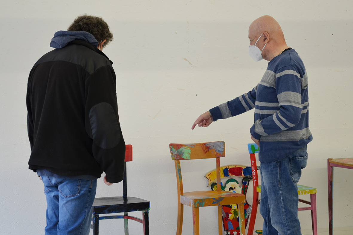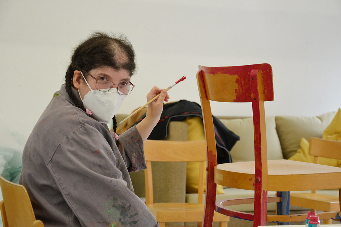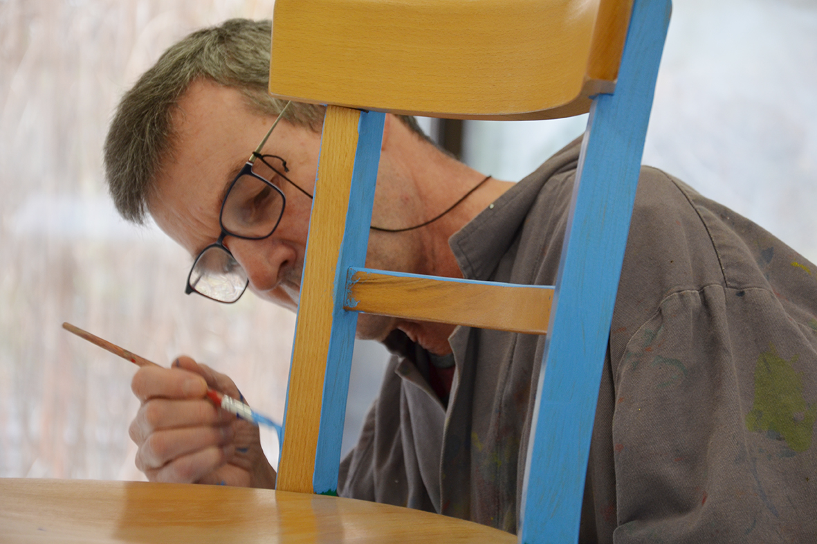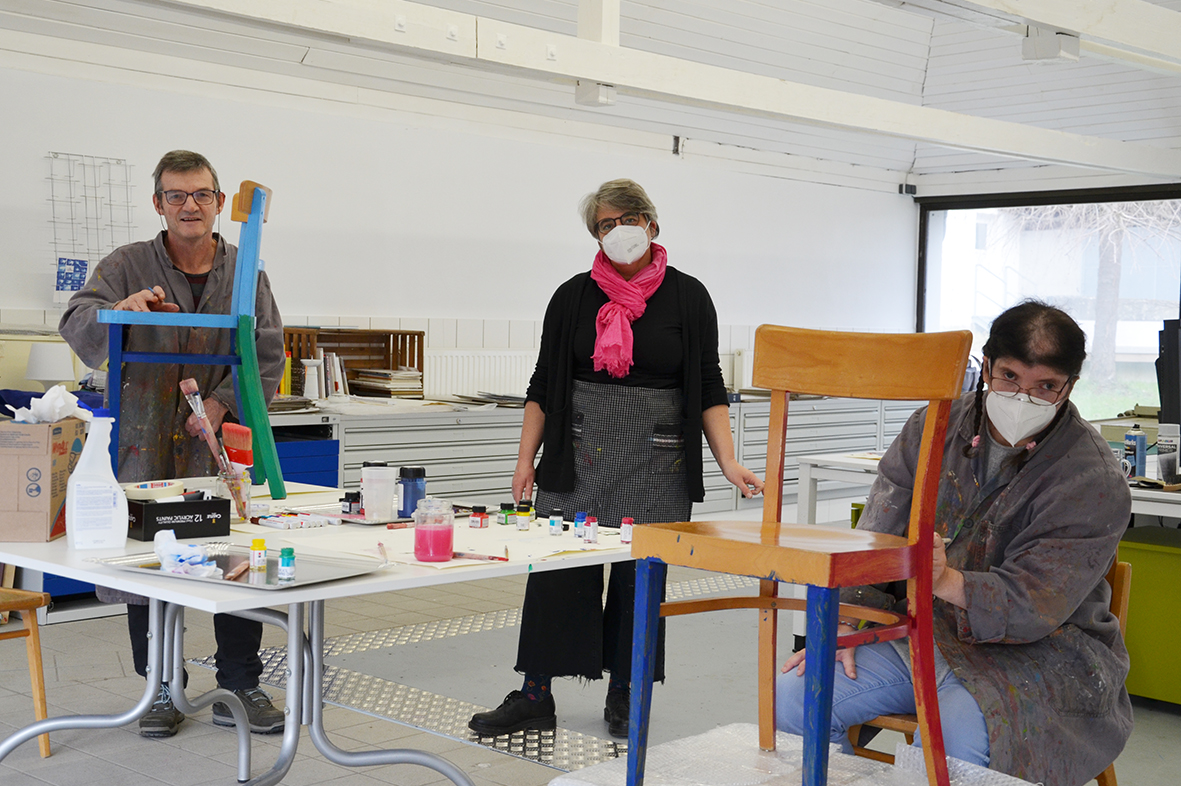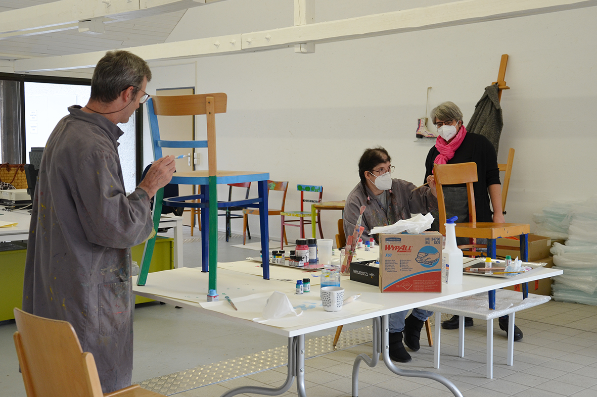 Für die ursprünglich im Advent geplante Ausstellung in der Galerie KULTURFORMEN am Pfarrplatz werden – mit etwas zeitlicher Verzögerung – Möbel und Objekte einer neuen Gestaltung zugeführt.  Geschehen tut das mit einer liebevollen Hingabe, die den fertigen Stücken auch anzusehen ist. Unter der Begleitung von Kristiane Petersmann bemalen oder "bezeichnen" Kund*innen aus Schön Stühle, Tische und wunderbare Kuriositäten, die schließlich den Galerieraum in Linz zu einer in mehrfacher Hinsicht besitzbaren Wunderkammer machen werden. Für unseren Newsblog werfen wir hiermit einen Blick in die Kunstwerkstatt…