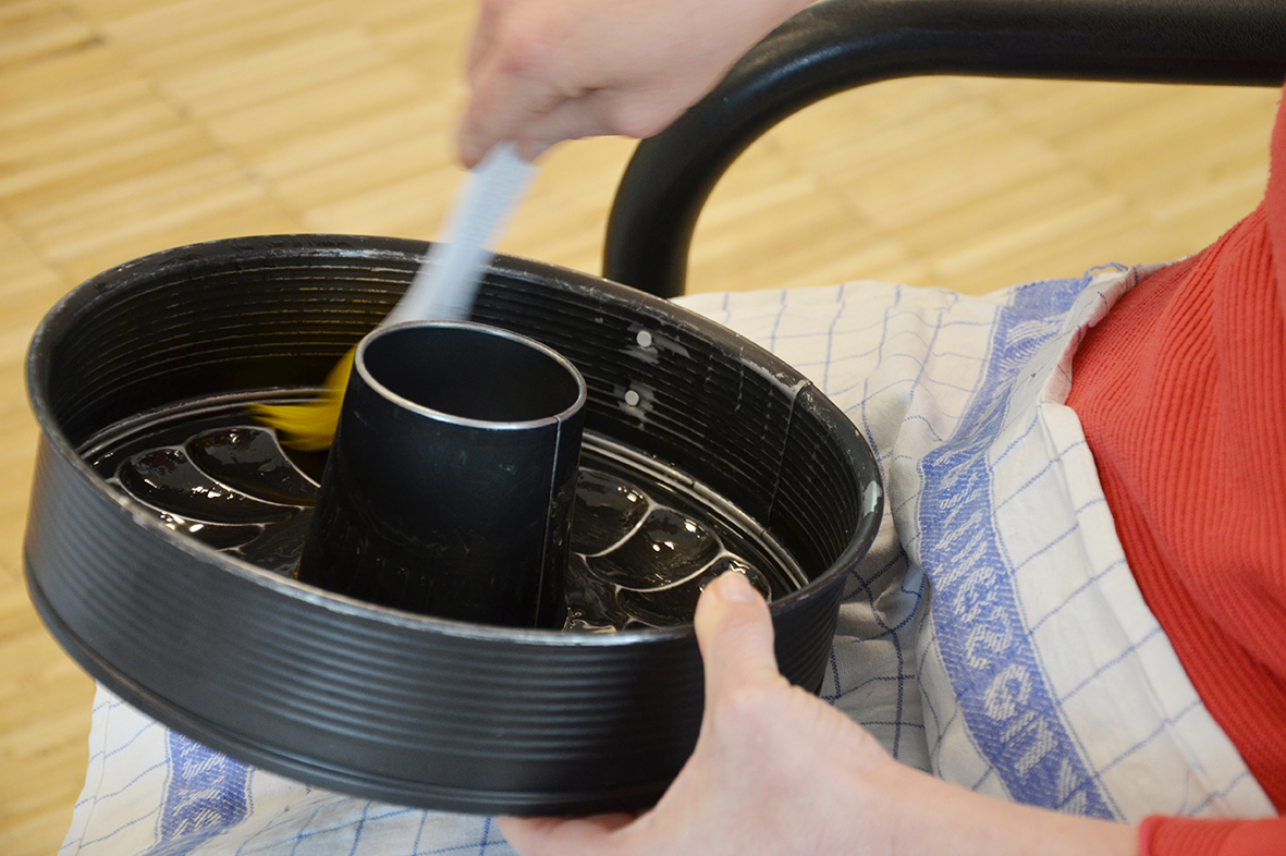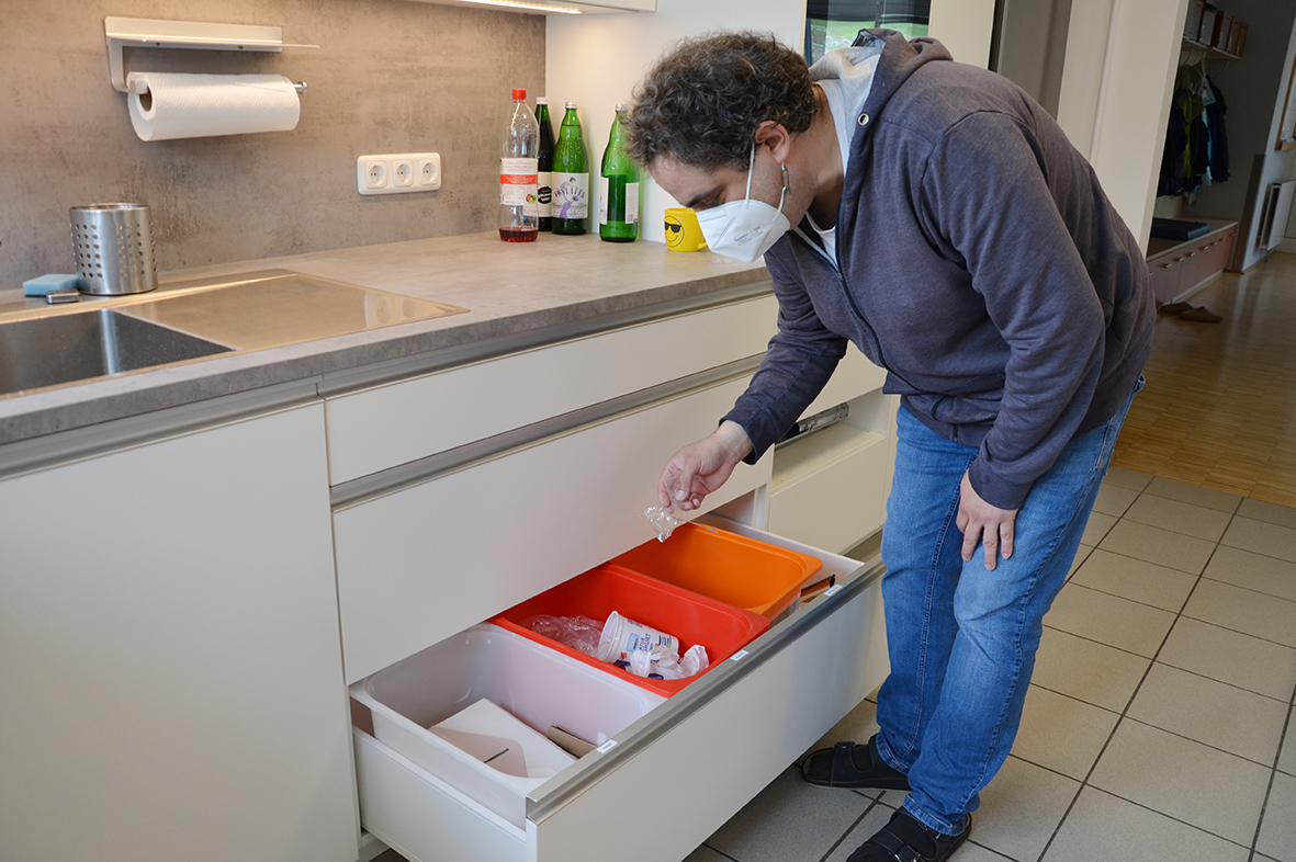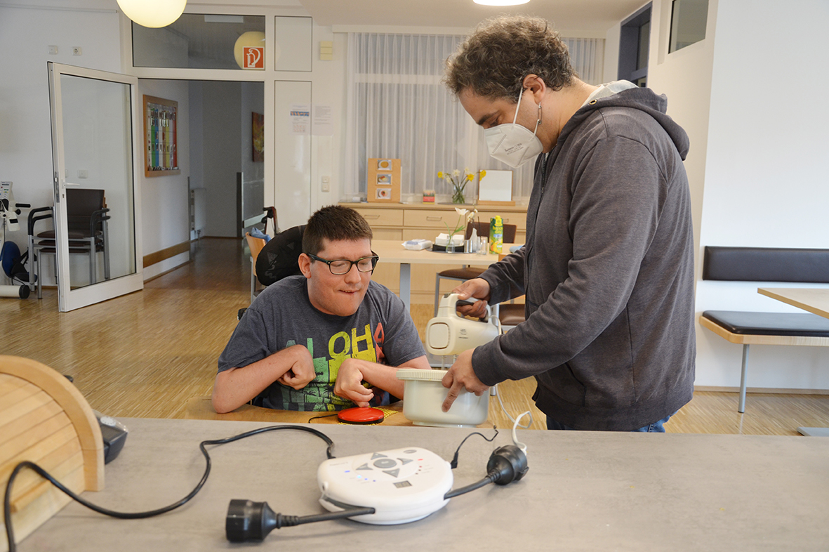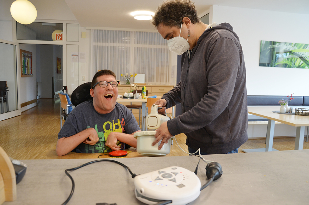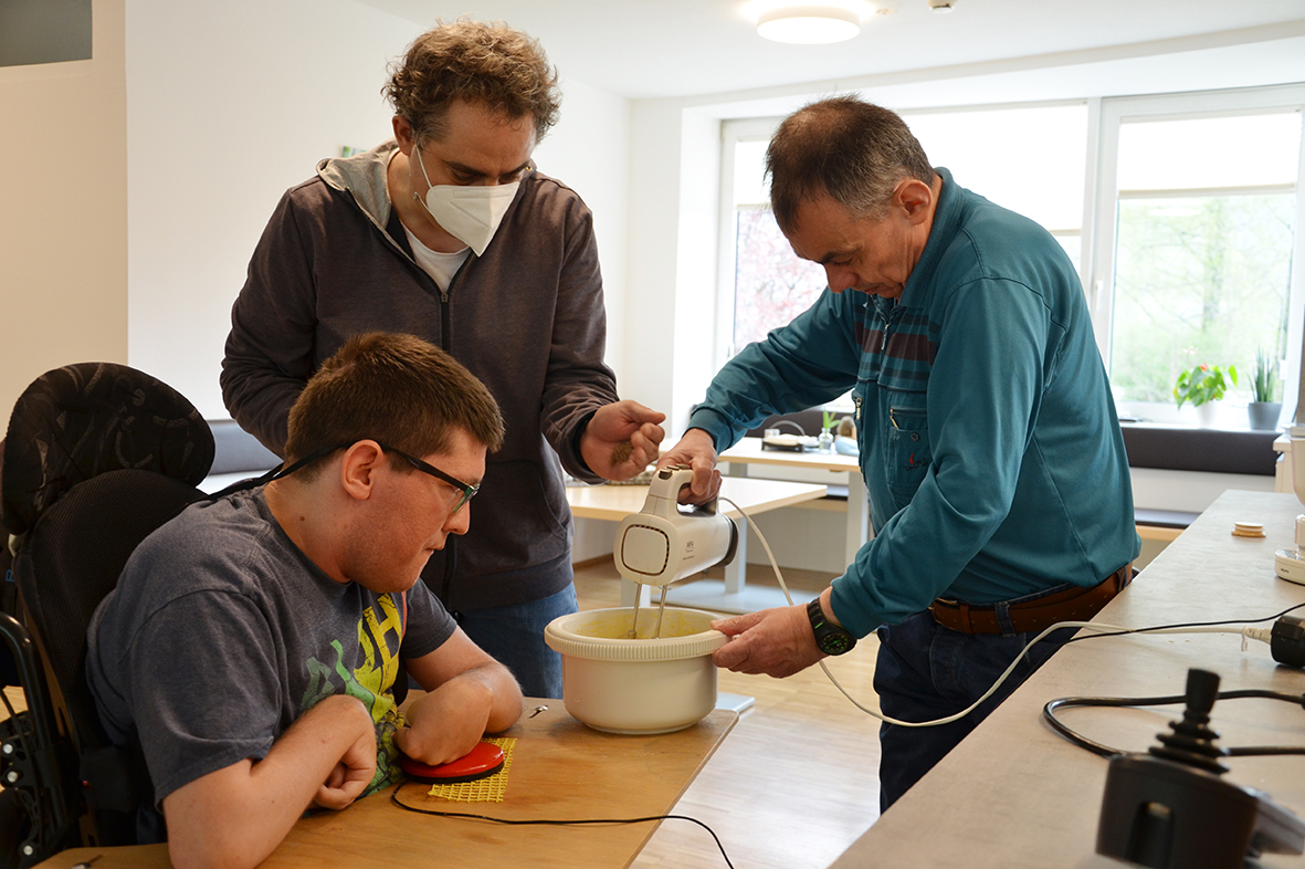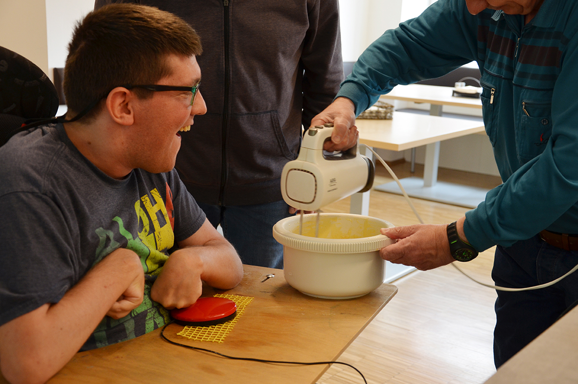 Einfach zu öffnende Türen und Laden, ein gut zugängliches Abwaschbecken, ein moderner Geschirrspüler, ein  gut platziertes Mülltrennsystem, ein Vorratsschrank, dessen Regale leichtgängig herausfahren und übersichtlich präsentieren, was in ihnen steckt… alles ist gut durchdacht. Ganz besonders wichtig ist der Mittelbau des Refugiums, um den herum sich das Leben beim Kochen und wieder Zusammenräumen in der Küche abspielt. Dass das gemeinsam richtig Spaß machen kann, ist hier zu sehen. Mit einem speziellen Gerät, das zwischen Stromquelle und ein Elektrogerät, wie zum Beispiel einen Mixer geschaltet wird, können auch Menschen, die ein Elektrogerät sonst nicht bedienen könnten, aktiv am Geschehen teilhaben. Über einen großen roten Knopf kann damit – wie hier der Mixer – ein- und ausgeschaltet werden. Powerlink heißt das praktische Gerät.