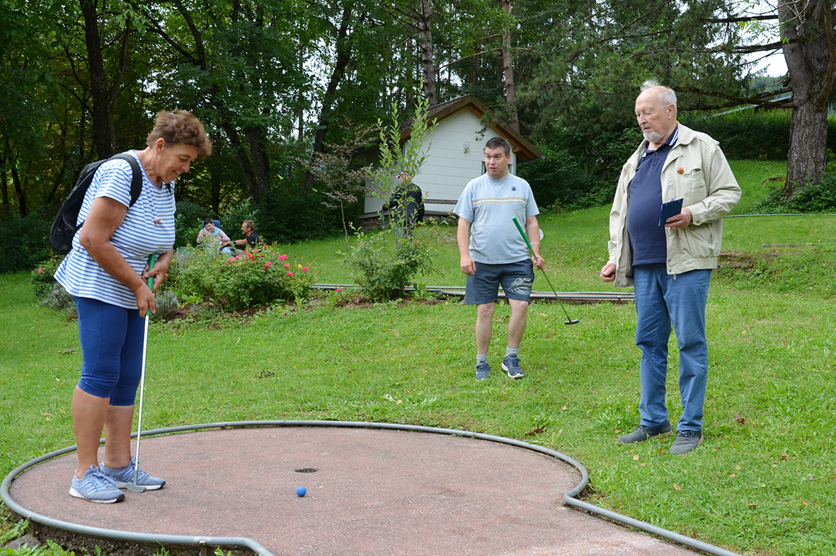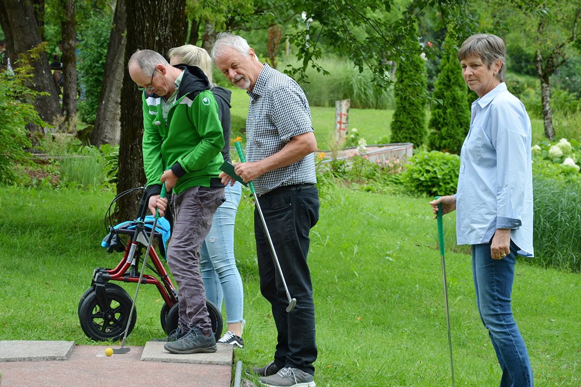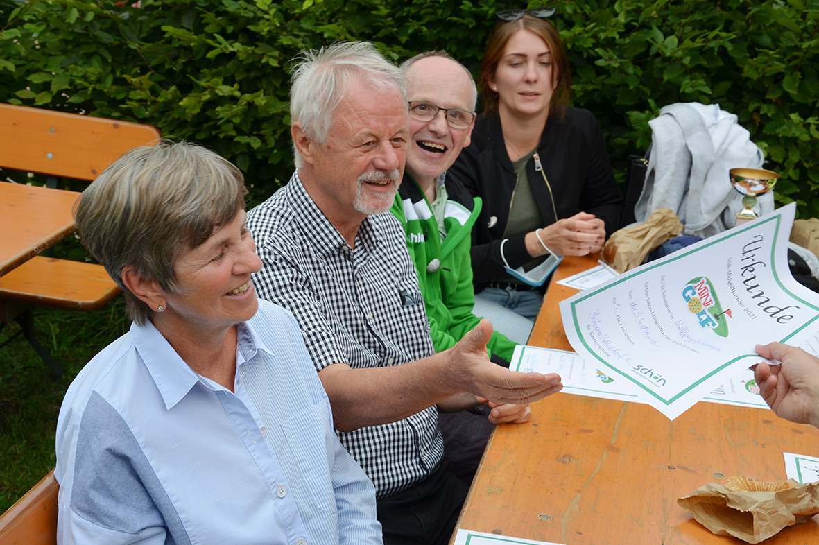 Nach der Absage der "großen" Veranstaltung, die in diesem Sommer am Minigolfplatz als Fest geplant gewesen wäre, konnte zum Glück unser Minigolfturnier im klassischen Stil viele interessierte Teilnehmer*innen aus Schön und auch einige Gäste, von der DIG Klaus über die Lebenshilfe Pettenbach bis zum Seniorenbund Micheldorf motivieren, dabeizusein. Gespielt wurde in unterschiedlichen Teams, so traten die Mitglieder des Seniorenbundes gemischt mit Schönerinnen und Schönern an. Auch der Obmann der GSI, Dr. Wolfgang Schwaiger und seine Frau Angela bildeten gemeinsam mit Christian Klein ein zielsicheres Team, das am Ende auch einen der Preise erhielt.
