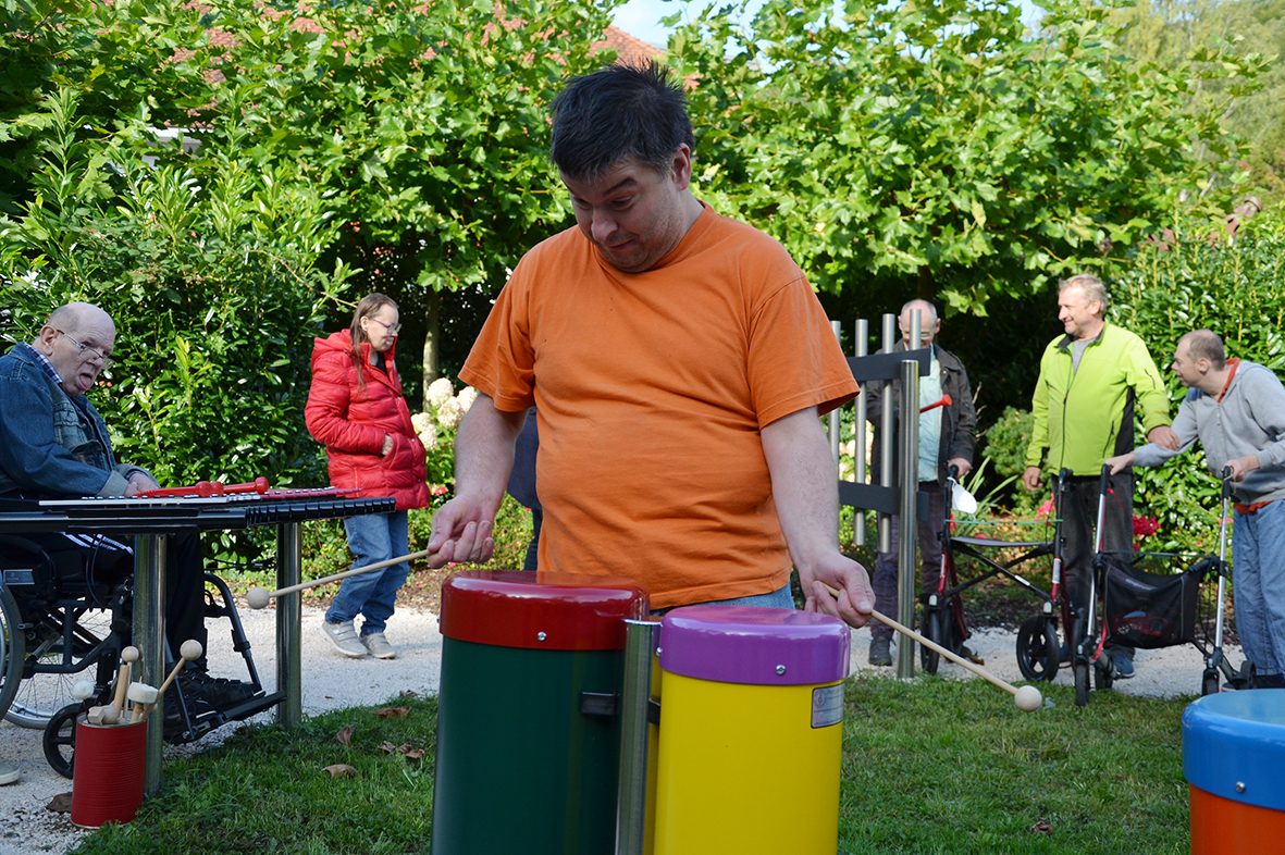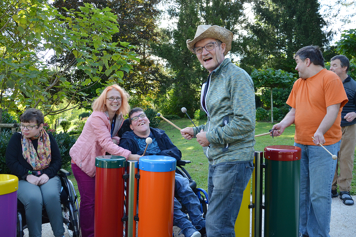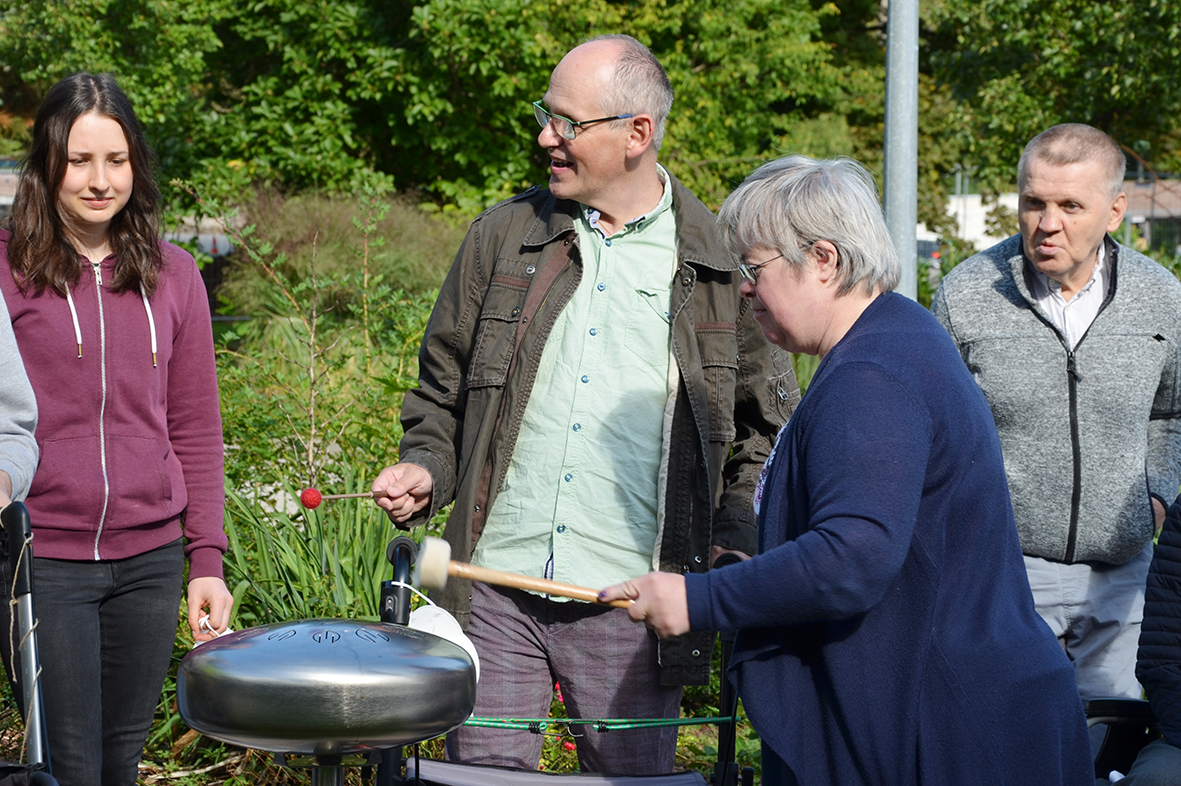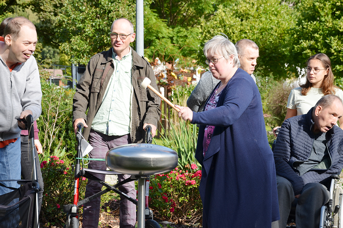 Zur gemeinsamen Erstbespielung versammelten sich viele unserer Bewohnerinnen und Bewohner, sowie die Menschen die in unsere Tagesstruktur kommen mit ihren Betreuerinnen und Betreuern. Und sie haben mit viel Spaß und großer Freude gemeinsam auf den tollen neuen Instrumenten gespielt.