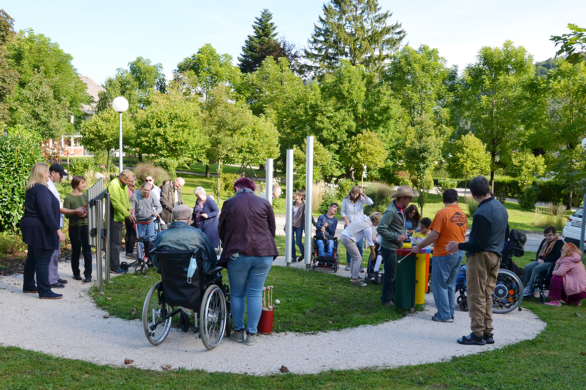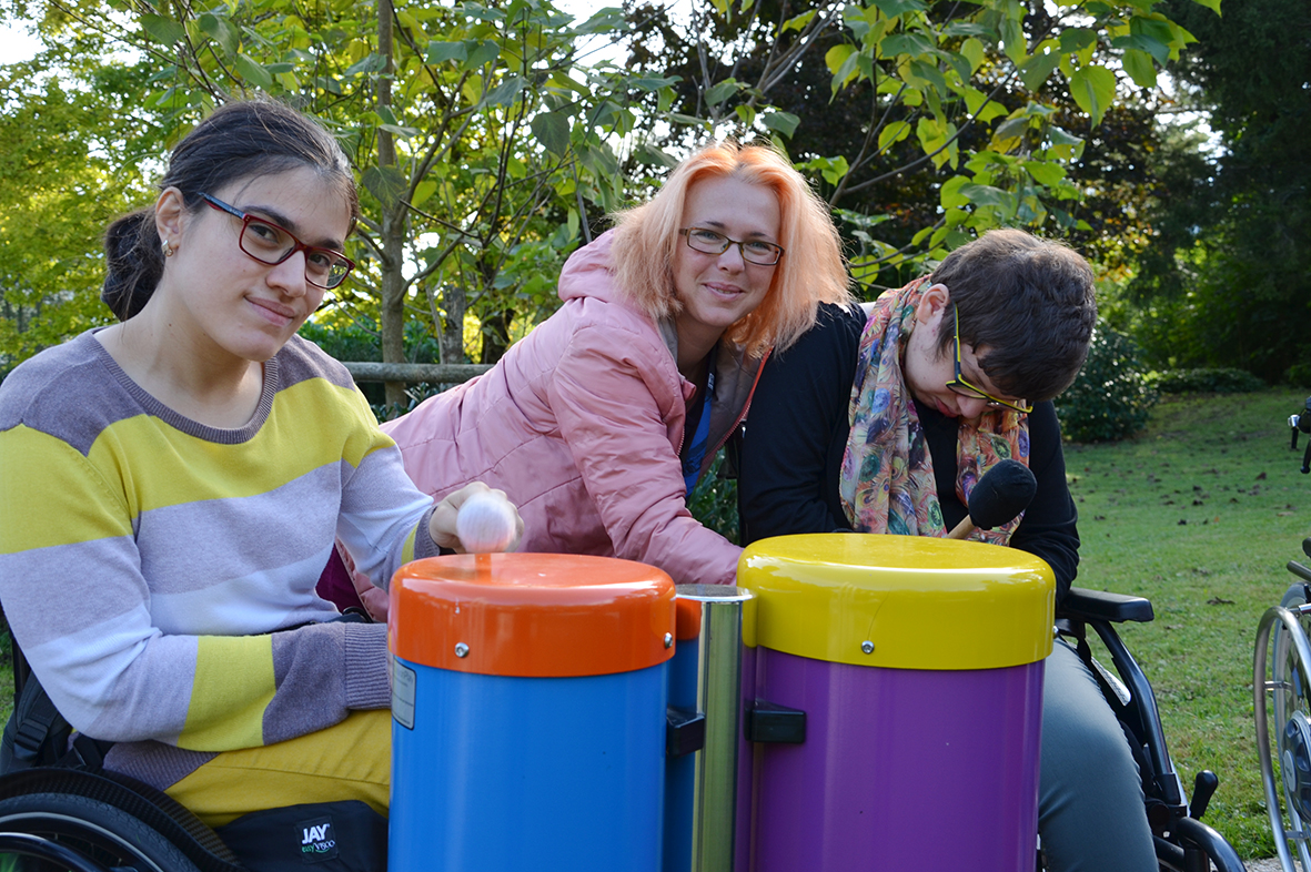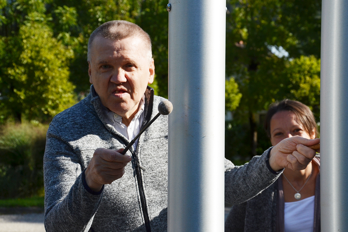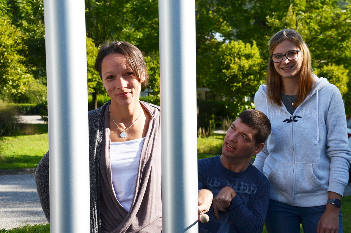 Anfang dieses Herbstes wurden neue Klang-Objekte im Außenbereich, direkt vor dem Kreuzbichlhof aufgestellt und diese sind seither viel in Betrieb! Hier können Menschen, auch mit schweren Beeinträchtigungen, basale Erfahrungen mit Klängen erleben. Alleine oder gemeinsam mit einer betreuenden Person, oder auch im Zusammenspiel mit anderen, bringen sie die unterschiedlichen Objekte zum Klingen. Die Töne, die den Instrumenten entlockt werden können, sind schön und warm und das Spielen ist spannend und macht richtig Spaß!