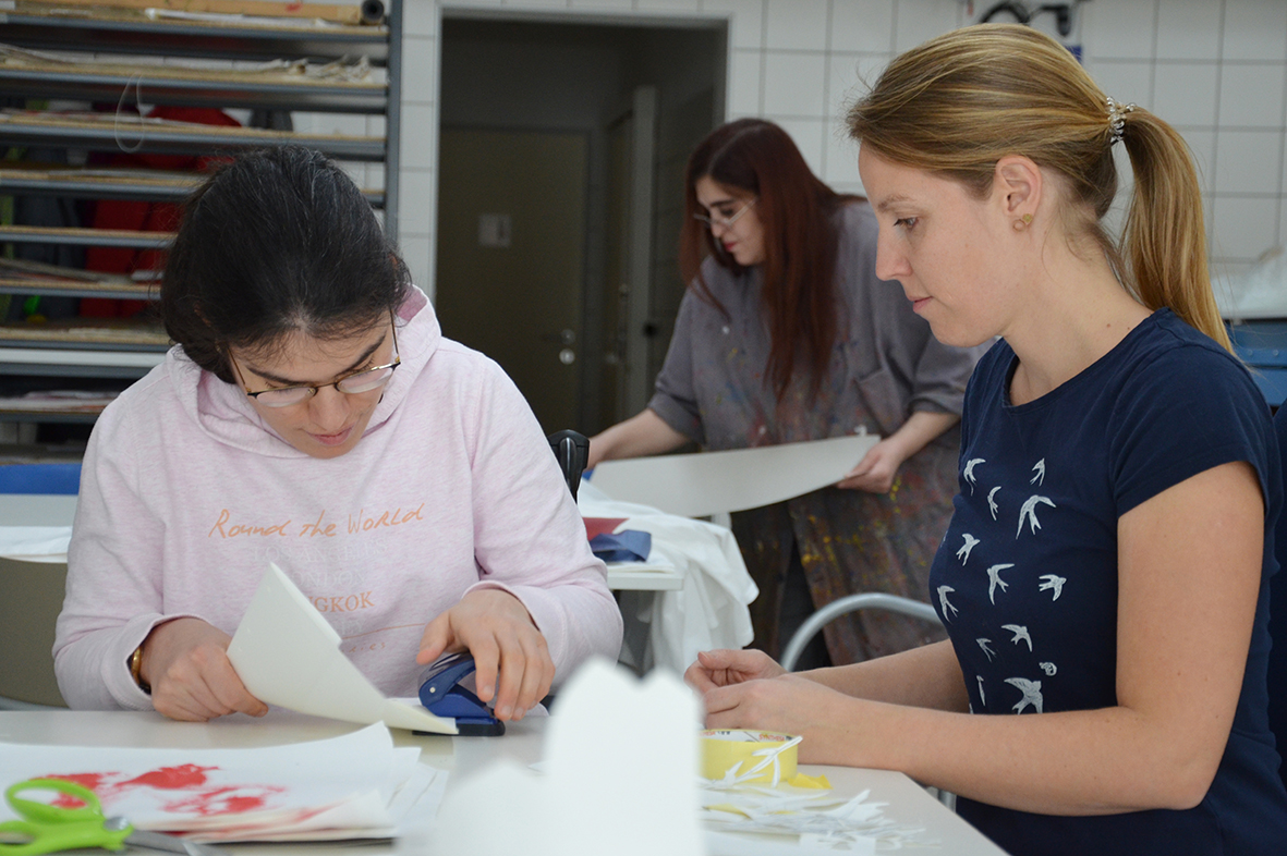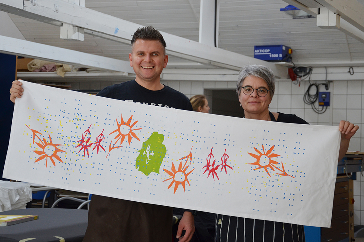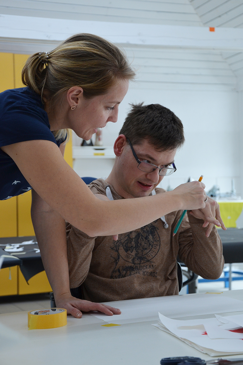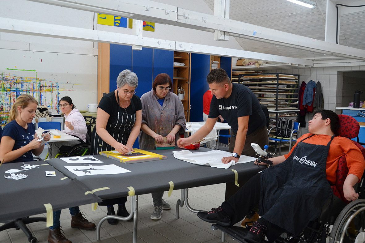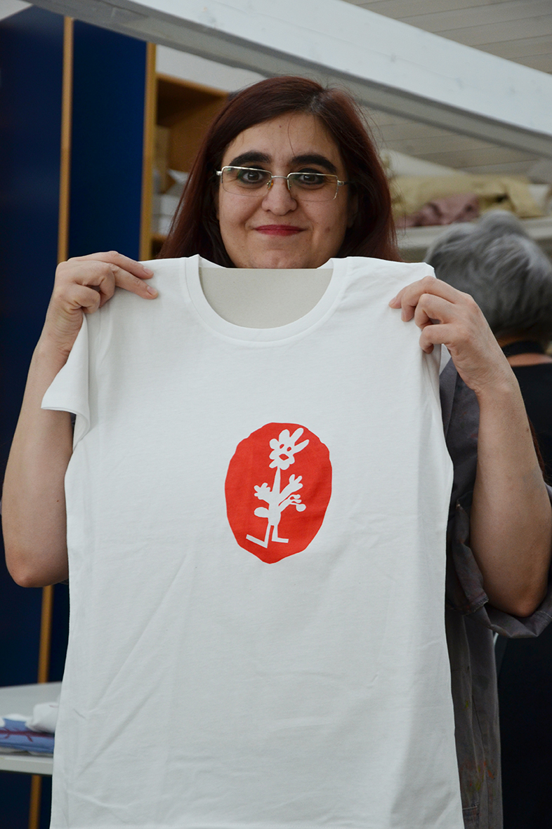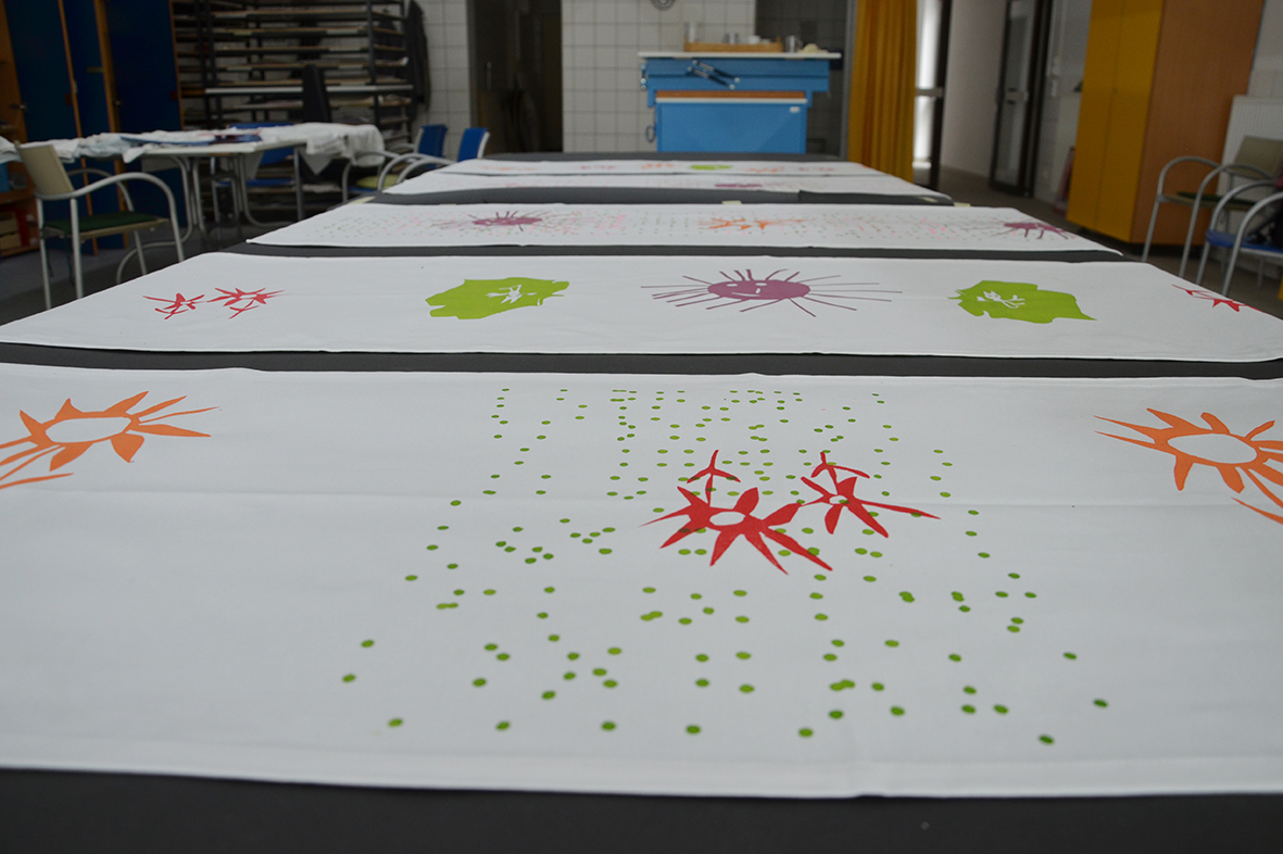 Gemeinsam werden schon die Motive erstellt, die ausgeschnitten und dann gedruckt werden. Produziert wurden diesmal kreativ gestaltete Tischläufer – jeder ein Unikat – T-Shirts und Stofftaschen.