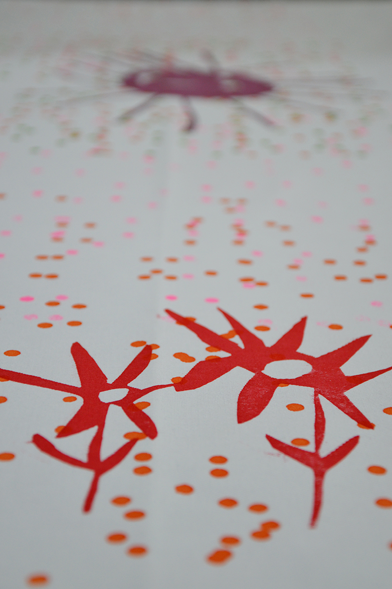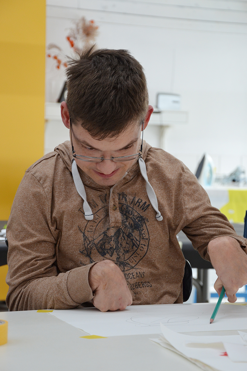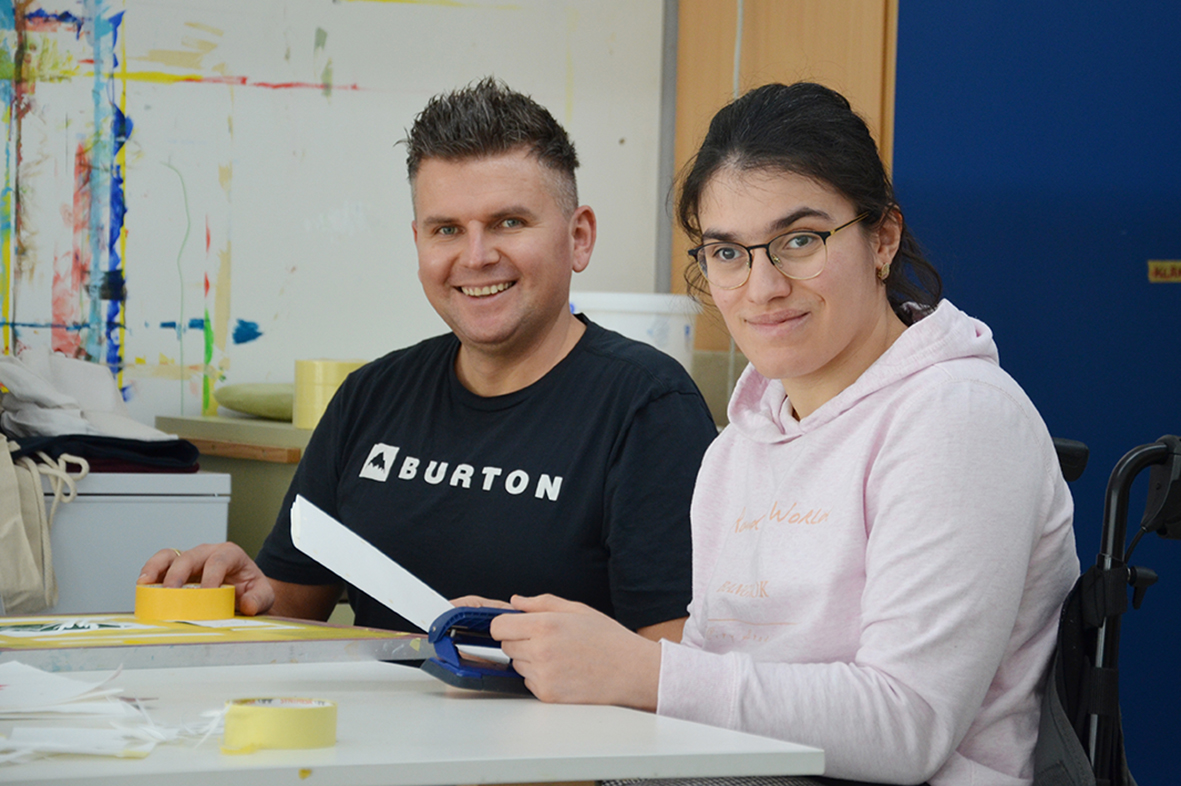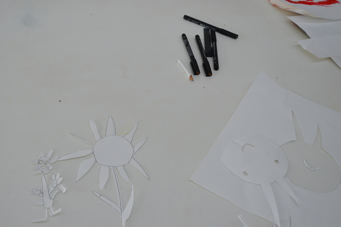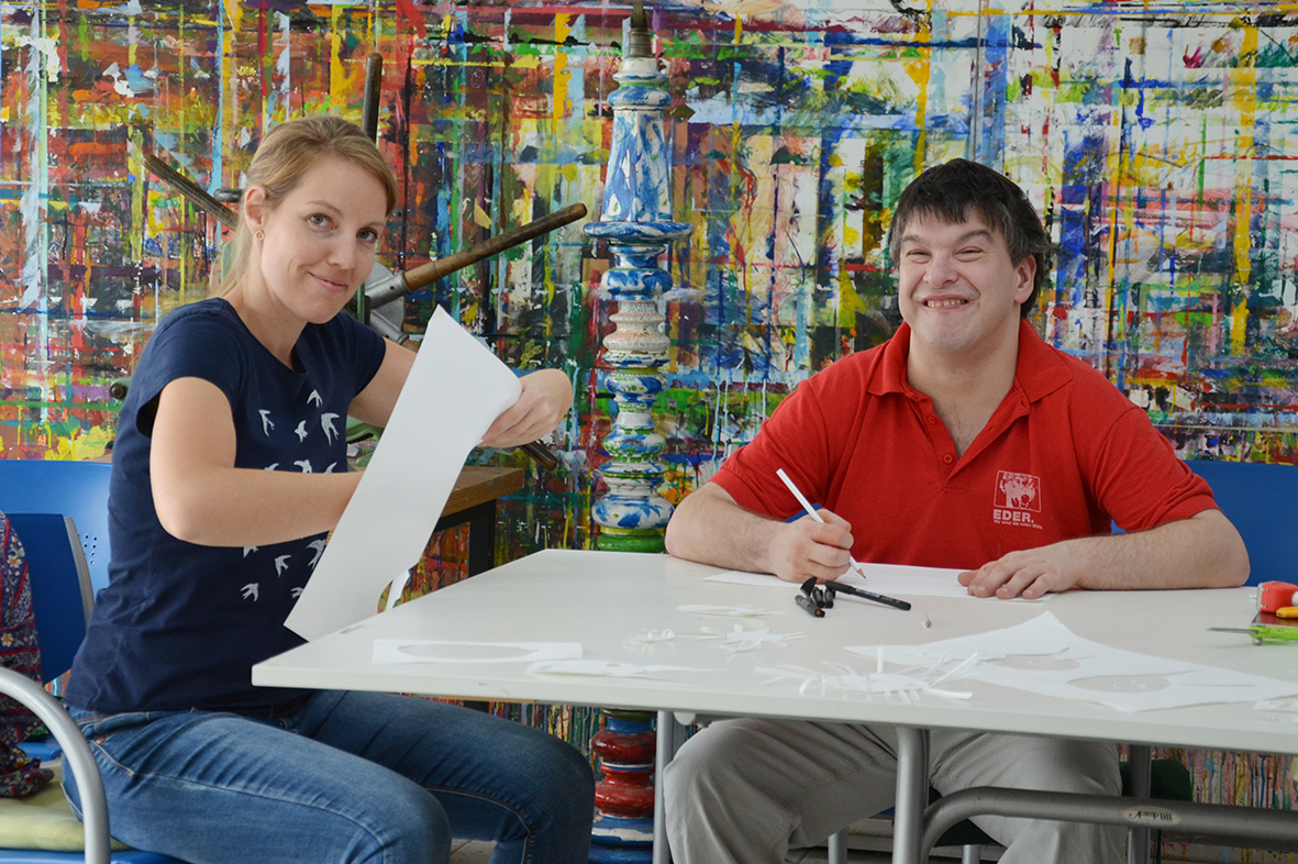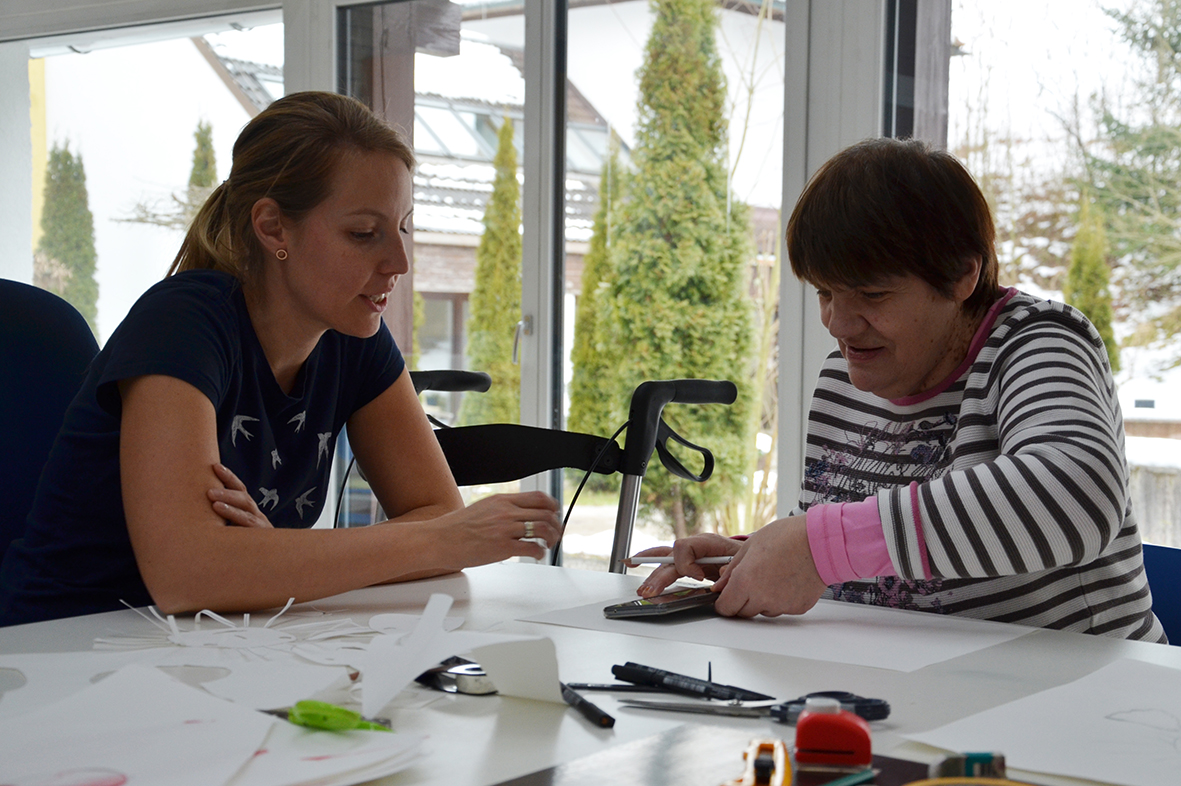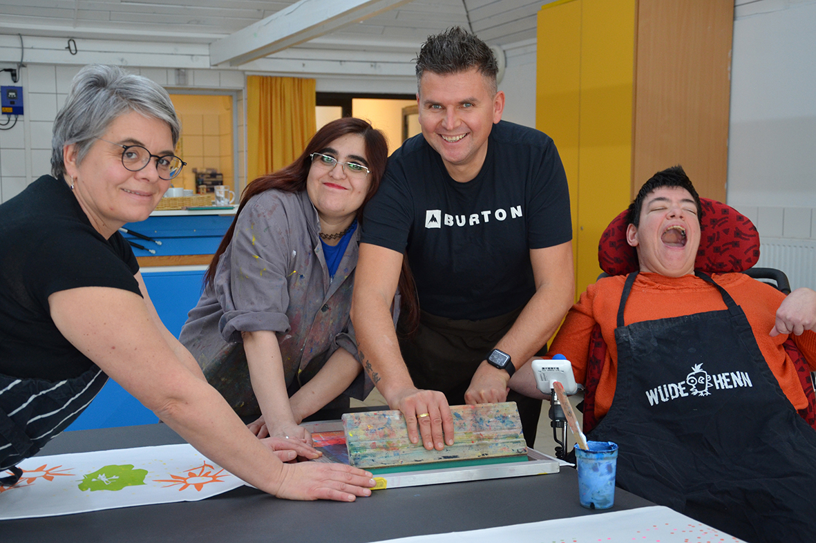 Gemeinsam werden schon die Motive erstellt, die ausgeschnitten und dann gedruckt werden. Produziert wurden diesmal kreativ gestaltete Tischläufer – jeder ein Unikat – T-Shirts und Stofftaschen.