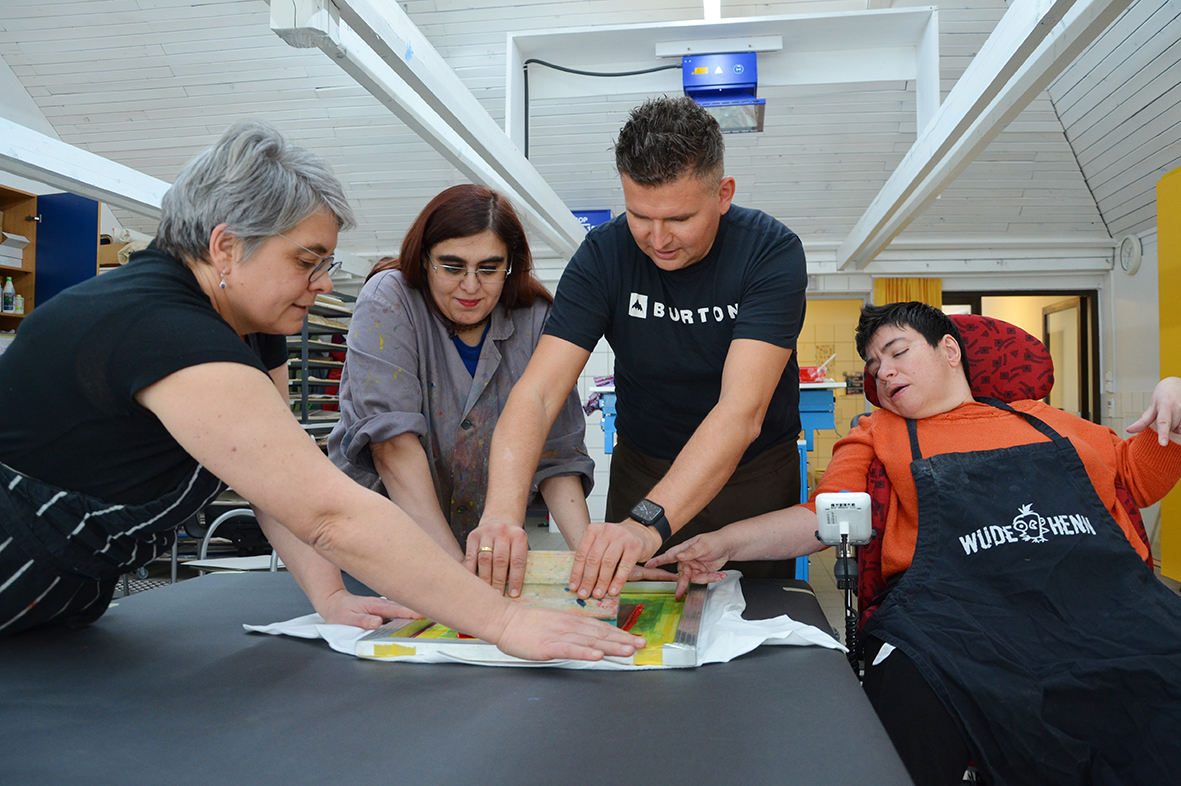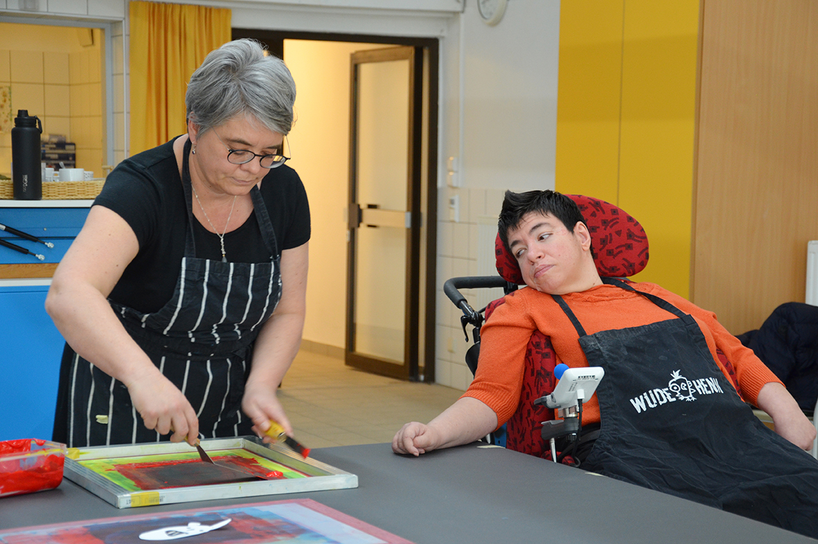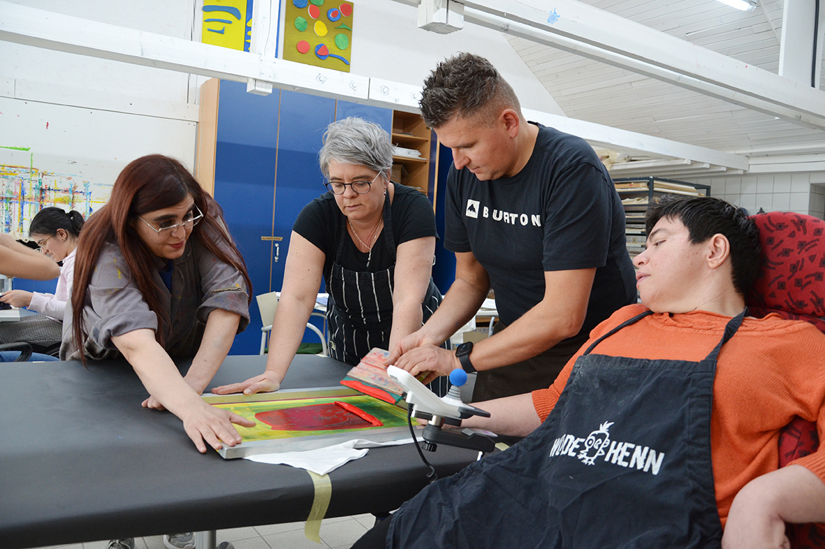 In der Kunsthalle Schön herrschte kürzlich Hochbetrieb in der Siebdruckerei. Interessierte Kund*innen von Schön können hier mit einer Technik bei der Schablonen aus Papier angefertigt werden, mittels derer dann – bei einem ersten Druck auf ein Sieb aufgebracht – wunderbar spannende und lustige Motive auf Textilien übertragen werden können, vom ersten bis zum letzten Schritt aktiv mitarbeiten.