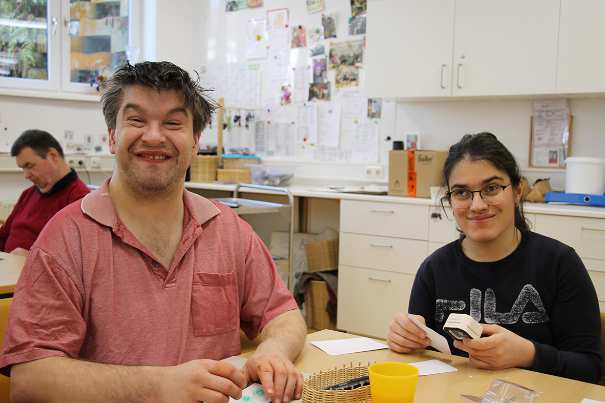 Heute eröffnen wir einmal den Blick in einen Teil unserer Werkstätten. Die Möglichkeiten für unsere Kund*innen – Bewohner*innen wie Kund*innen der Tagesstruktur – sich aktiv und ihren Möglichkeiten entsprechend einzubringen und mitzuarbeiten sind vielfältig. Täglich wird hier am Morgen besprochen, was jede einzelne Person an diesem Tag tun wird und wie die Arbeit genau aussieht. Natürlich ist vieles schon bekannt und klar, aber auch Raum für Flexibilität ist vorhanden.