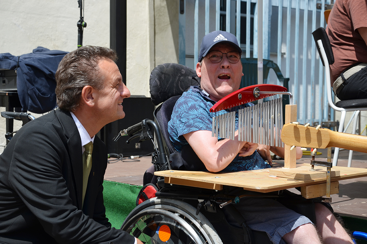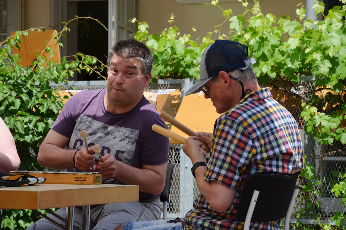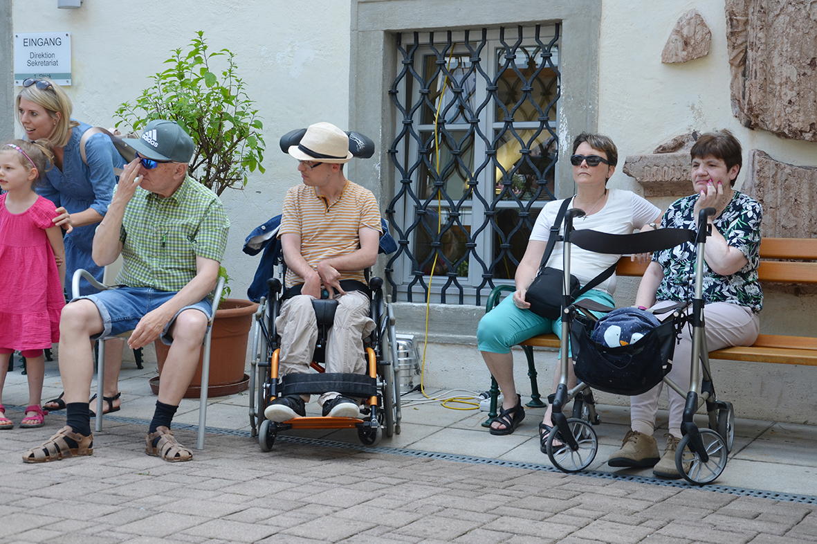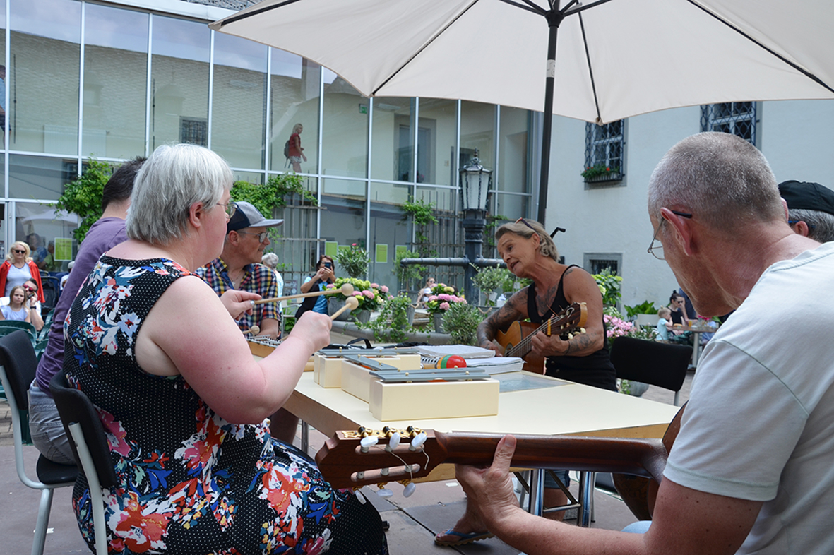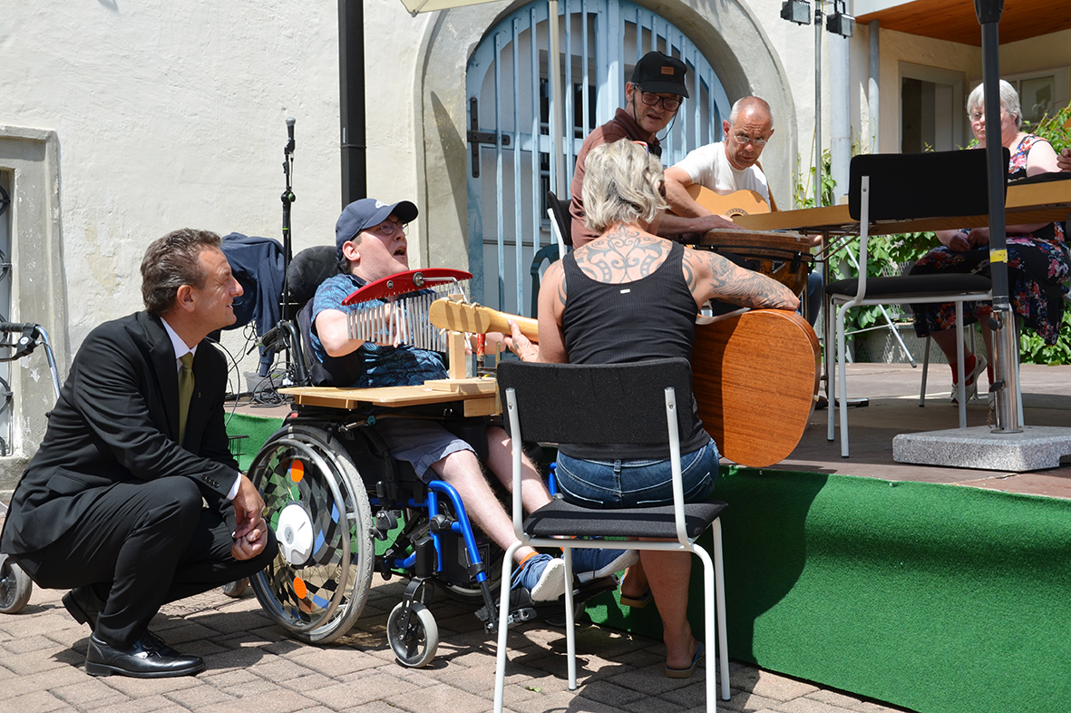 Kund:innen aus Schön waren einerseits Beteiligte und andererseits selbst Gäste, die das Ambiente und die Stimmung genießen konnten. Mit einer musikalischen Darbietung im Schlosshof, war die Musikgruppe aus Schön mit ihrer Lehrerin Ingrid Walter (Kreatives Musikgestalten) mit einem schwungvollen und lustigen Auftritt zu erleben. Ein verdienter Riesenapplaus war der Lohn für die Musiker:innen. Bei einer Ausstellung, die unter der Leitung des Lehrers Mag. Manfred Schöller (Klang und Farbe) an diesem Nachmittag entstand, luden Manfred Schöller und die Schüler:innen aus Schön Gäste ein, sich gemeinsam mit ihnen zeichnerisch zu entfalten. Hier war auch der Micheldorfer Bürgermeister Horst Hufnagl mit kreativem Engagement dabei. In gleich großen, quadratischen Formaten entstanden bunte Werke, die am Abend im Rahmen einer feierlichen Verrnissage von Musikschuldirektor Wolfgang Homar, Schön-Wohnbereichsleiter Mag. Michael Einzinger und der Kirchdorfer Kulturstadträtin Mag. Judith Oberdammer eröffnet wurde.