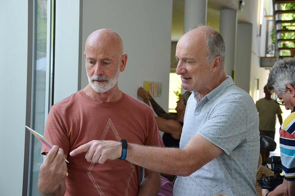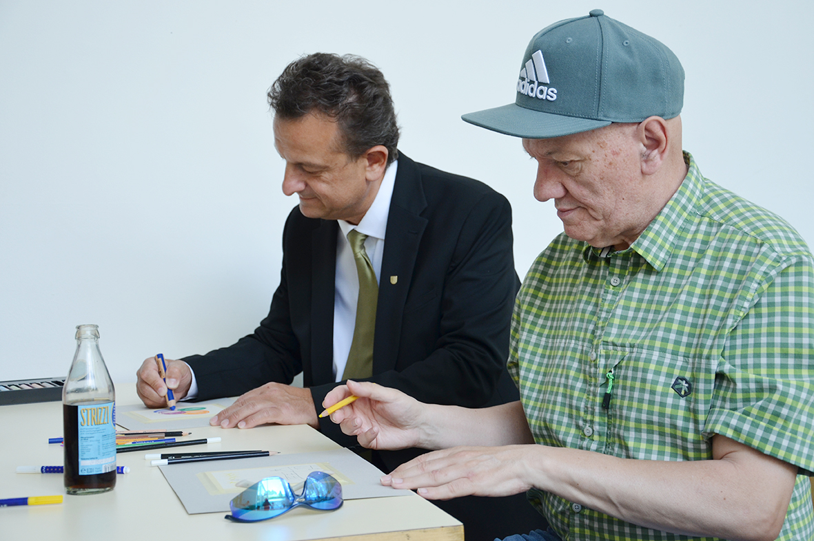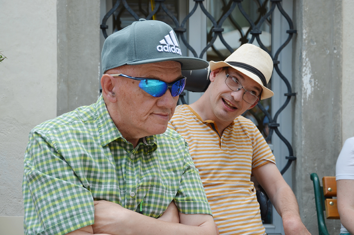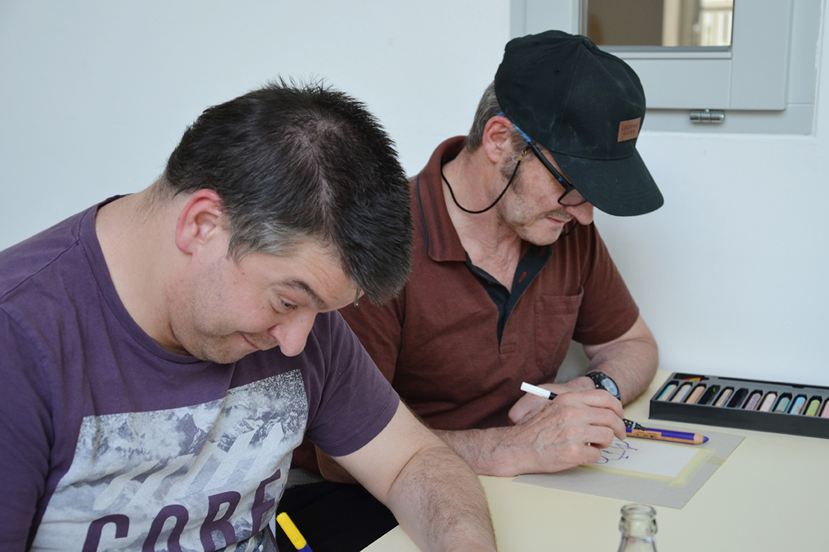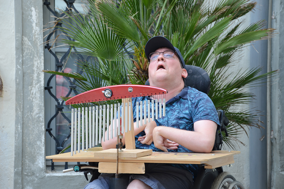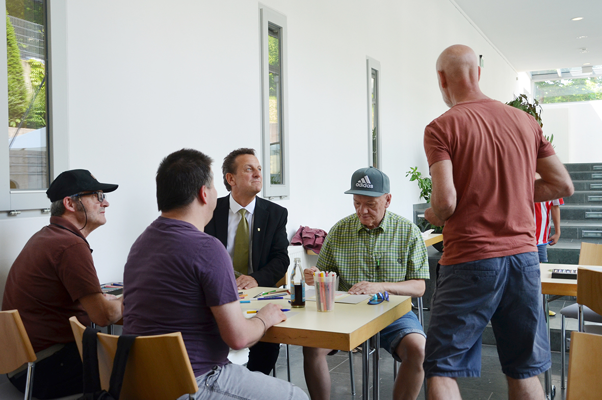 Kund:innen aus Schön waren einerseits Beteiligte und andererseits selbst Gäste, die das Ambiente und die Stimmung genießen konnten. Mit einer musikalischen Darbietung im Schlosshof, war die Musikgruppe aus Schön mit ihrer Lehrerin Ingrid Walter (Kreatives Musikgestalten) mit einem schwungvollen und lustigen Auftritt zu erleben. Ein verdienter Riesenapplaus war der Lohn für die Musiker:innen. Bei einer Ausstellung, die unter der Leitung des Lehrers Mag. Manfred Schöller (Klang und Farbe) an diesem Nachmittag entstand, luden Manfred Schöller und die Schüler:innen aus Schön Gäste ein, sich gemeinsam mit ihnen zeichnerisch zu entfalten. Hier war auch der Micheldorfer Bürgermeister Horst Hufnagl mit kreativem Engagement dabei. In gleich großen, quadratischen Formaten entstanden bunte Werke, die am Abend im Rahmen einer feierlichen Verrnissage von Musikschuldirektor Wolfgang Homar, Schön-Wohnbereichsleiter Mag. Michael Einzinger und der Kirchdorfer Kulturstadträtin Mag. Judith Oberdammer eröffnet wurde.
