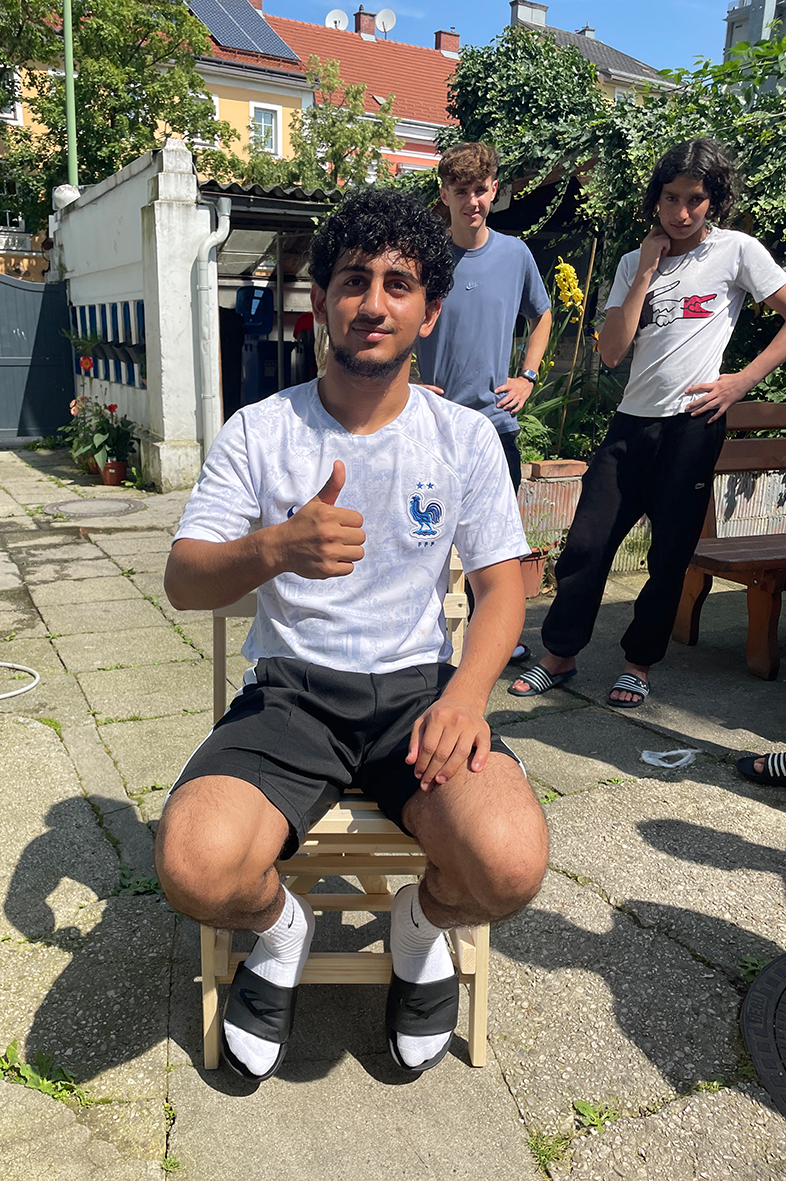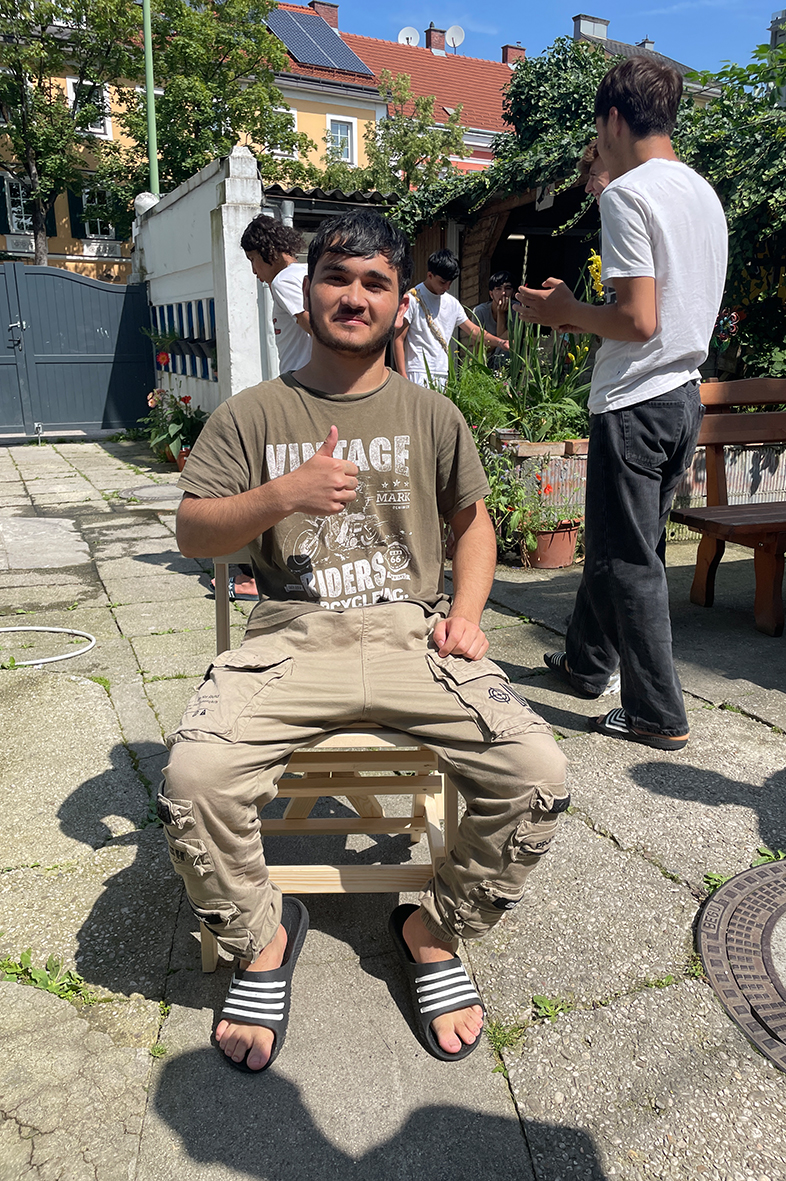 Geleitet hat den Workshop der Bühnenbildner Moritz Nitsche. Gemeinsam mit Kristiane Petersmann baute Moritz Nitsche mit unbegleiteten, minderjährigen Geflüchteten, die im Haus der NOAH in Wels leben, Sessel für den Garten des Hauses.