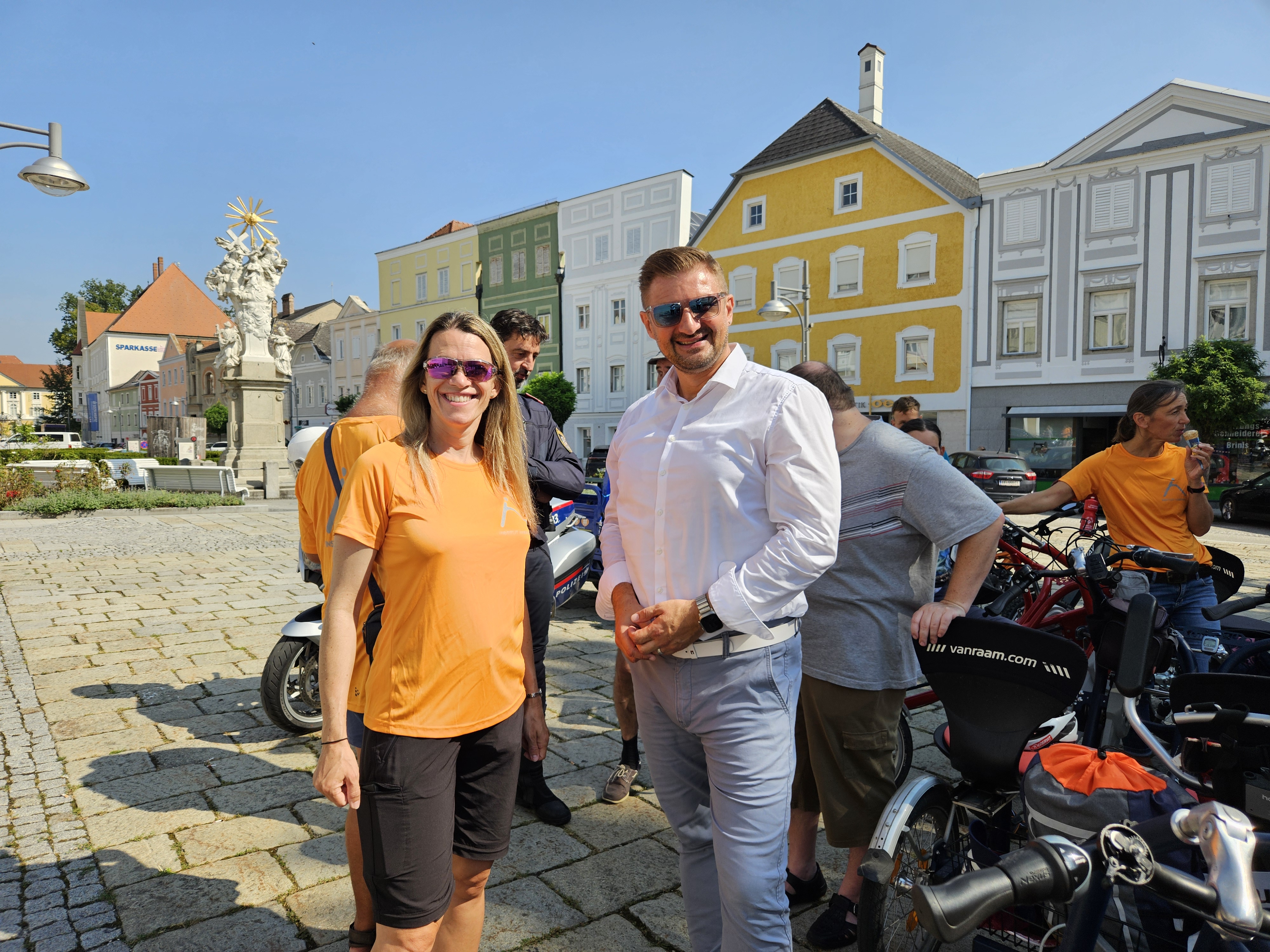 Der Weg führte uns in diesem Jahr zur Firma “hali”, die seit über 80 Jahren Büromöbel herstellt. Seit einigen Jahren besteht eine Kooperation zwischen der Firma und unserer Tagesstruktur in Eferding. Gestärkt durch kühle Erfrischungen und einer pikanten Jause ging es für unsere Radfahrer:innen dann auf den Hauptplatz in Eferding, wo die Gruppe von über 40 Biker:innen, mit einem Eis von Bürgermeister Christian Penn empfangen wurde.