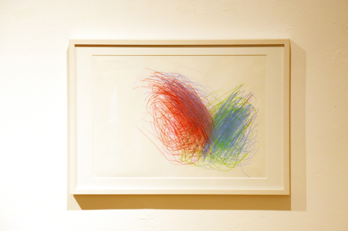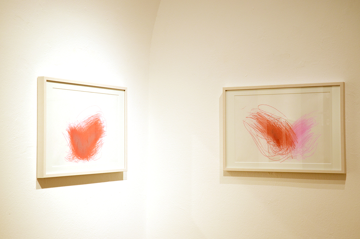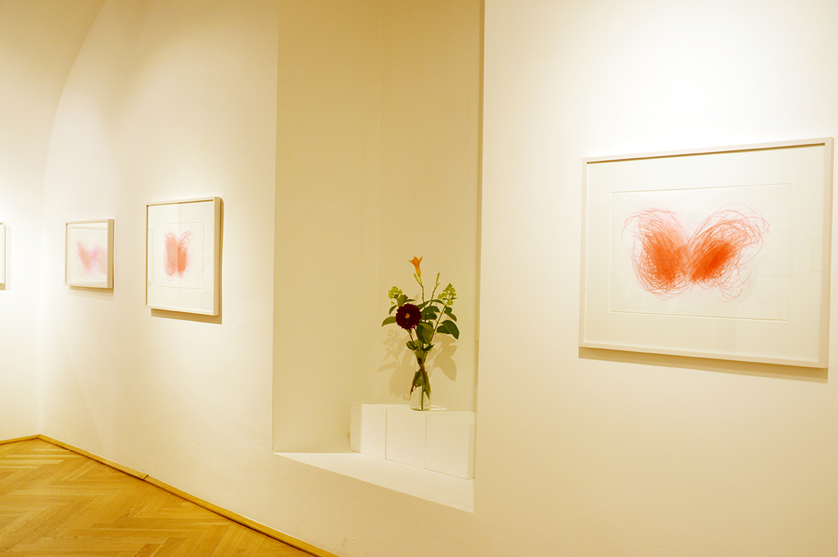 Doris Elke Feusthuber zeichnet beidhändig mit Farbstiften. In jeder Hand hält sie jeweils einen Stift, den sie auf dem Papier tanzen lässt. Erst den einen, dann den anderen, selten beide gleichzeitig, aber immer in vollendeten Bewegungen. So entstehen grafische Notationen der Bewegungen, die sich mehr und mehr verdichten. Die überlagernden Farbpigmente verleihen den entstandenen Formationen eine sinnliche, samtige Tiefe.
