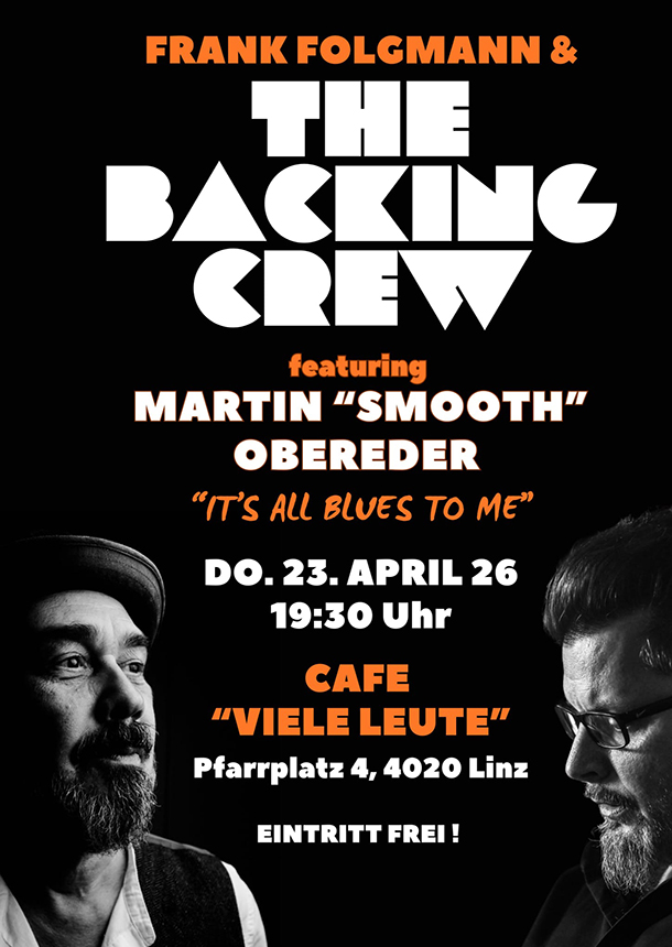 Frank Folgmann & The Backingcrew präsentieren an diesem Abend, ihr Programm „IT´S ALL BLUES TO ME“ mit Martin "Smooth" Obereder, Gesang und am Saxophon.